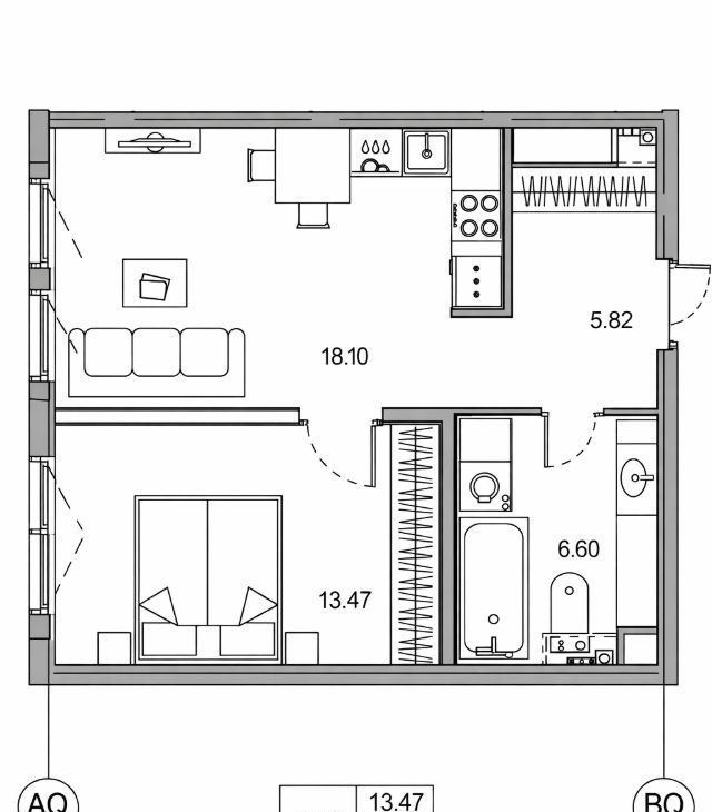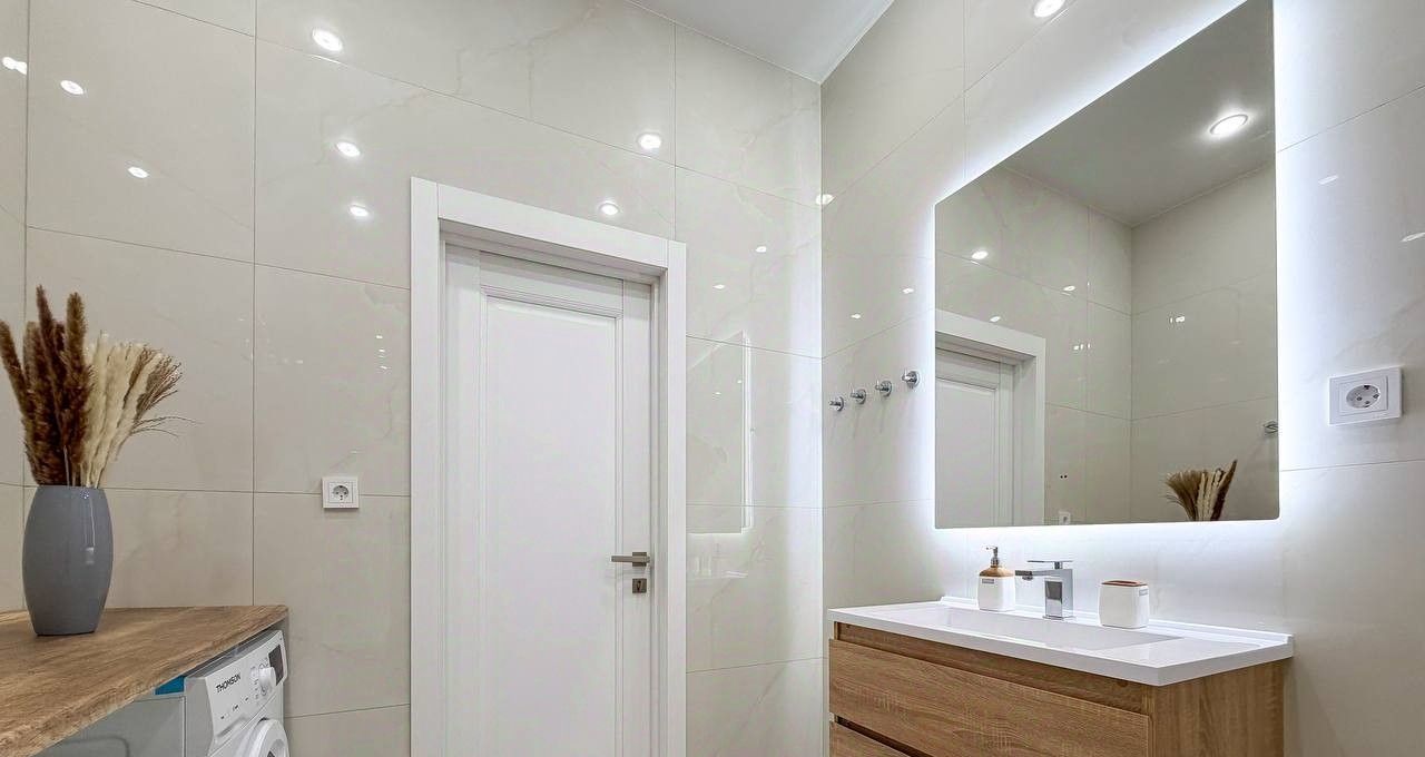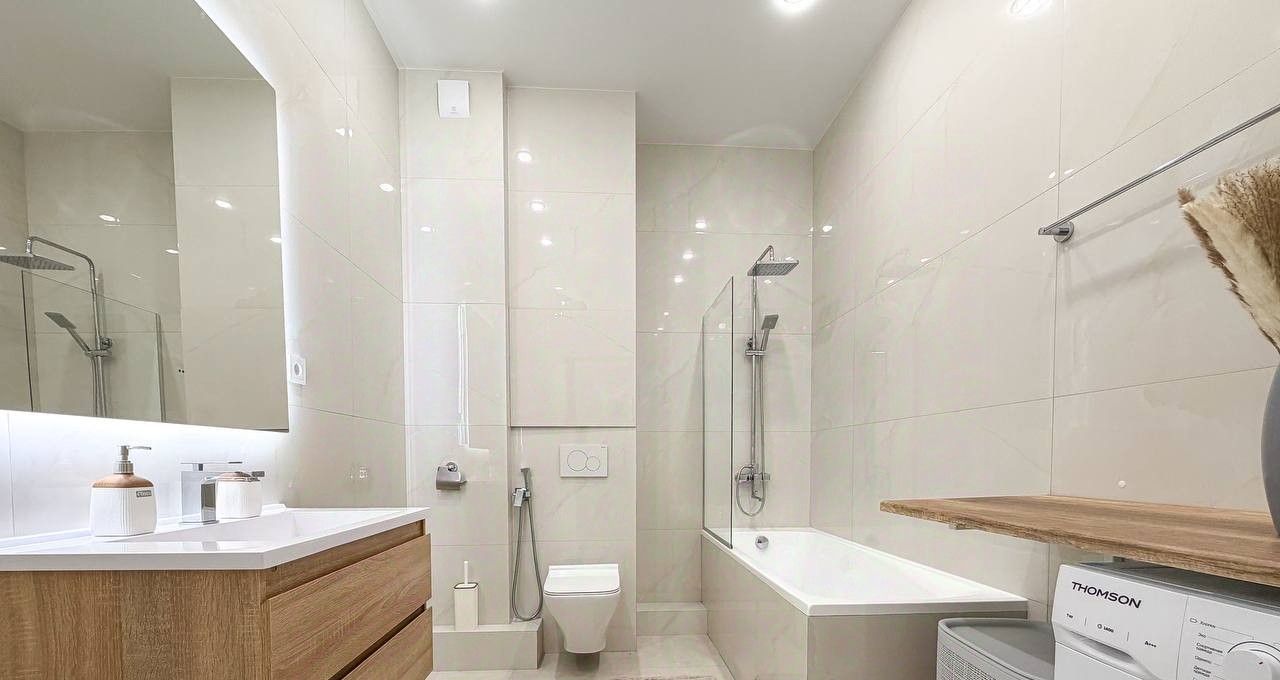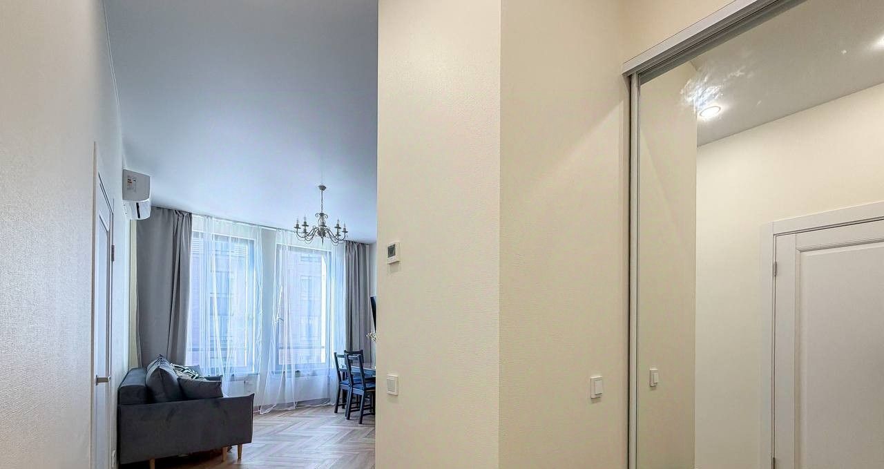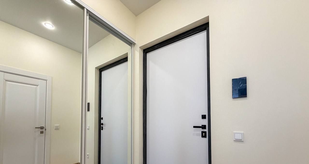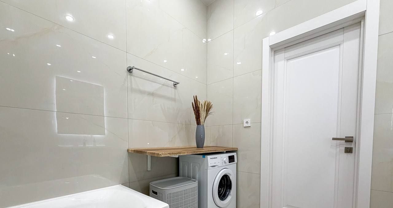 Планировка квартиры: изолированная спальня, просторная кухня-гостиная, совмещенный санузел. Есть вся необходимая мебель и бытовая техника для комфортного проживания, включая посудомоечную машинку и кондиционер. В квартире большие панорамные окна, которые выходят на солнечную сторону - очень много естественного света. Высота потолков - 3 метра. Из окон видно реку!