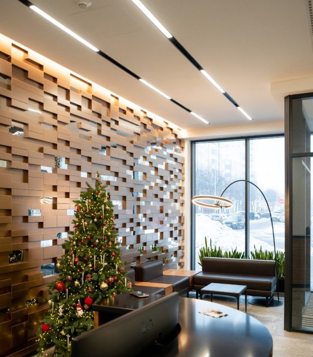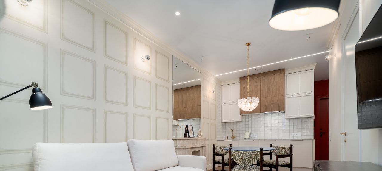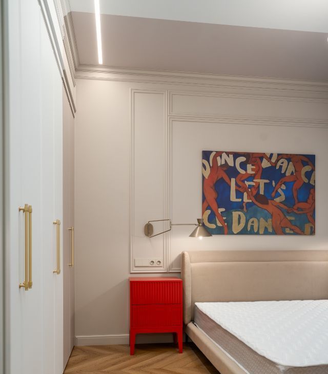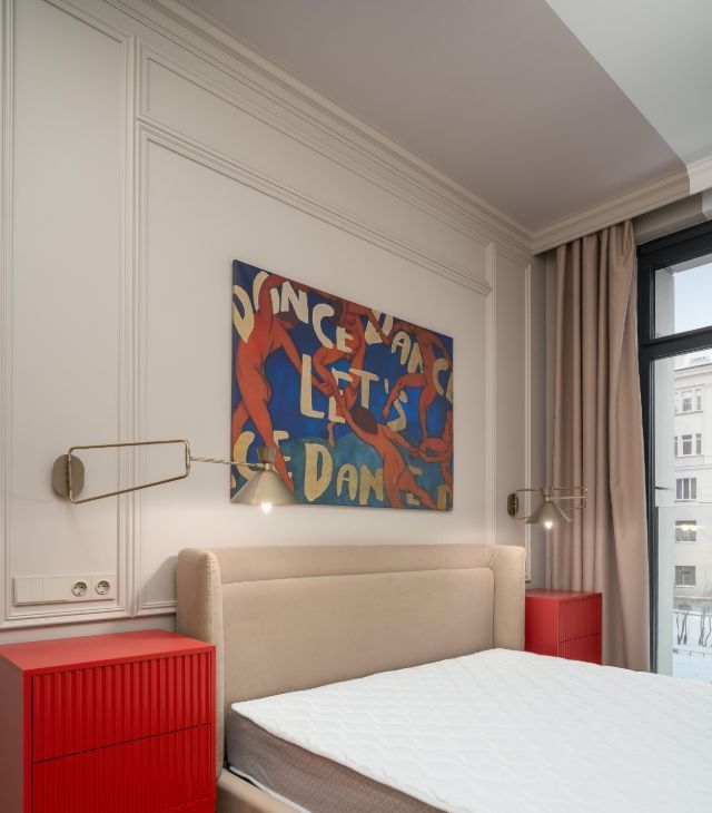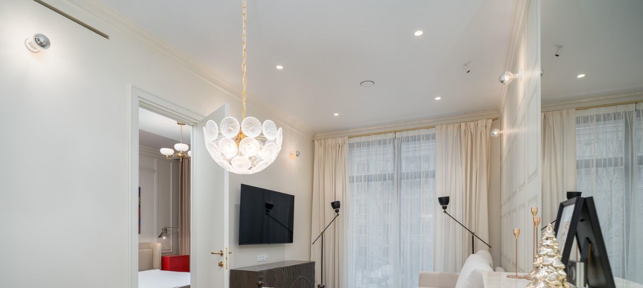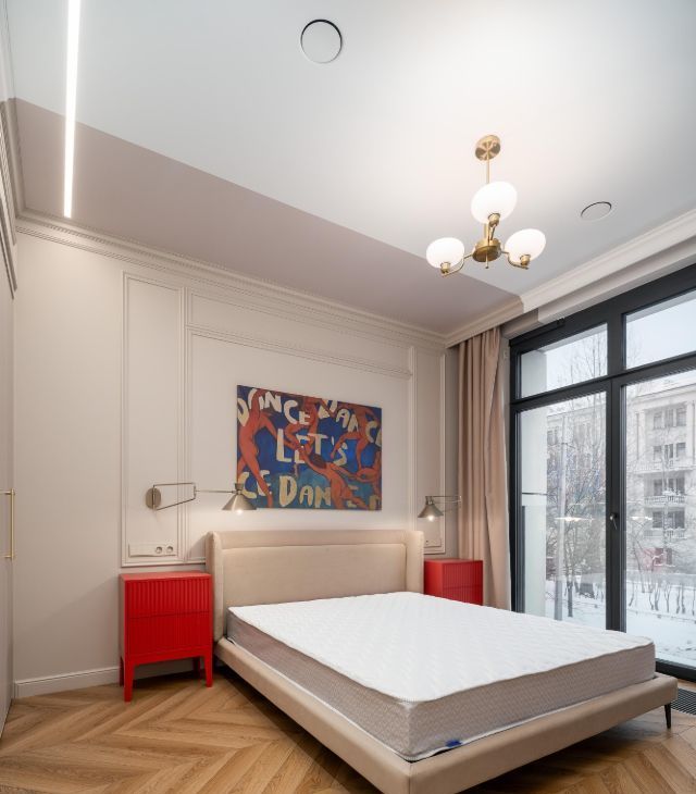 Многоуровневые сценарии освещения, мастер-выключатель, шторы blackout, роликовые шторы и тюль можно повесить дополнительно.