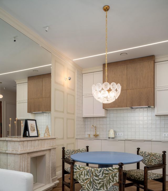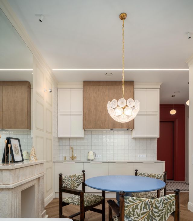 Винтажные отреставрированные стулья, мраморный декоративный камин, тёплые полы в прихожей и санузлах, кварц-виниловое покрытие пола.