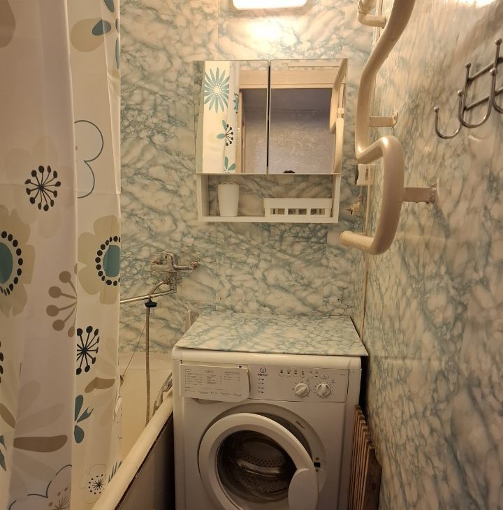 В квартире есть шкаф, комод для хранения одежды, спальное место, холодильник, микроволновая печь, стиральная машина.