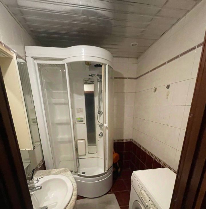 В ванной комнате — душевая кабина и стиральная машина.