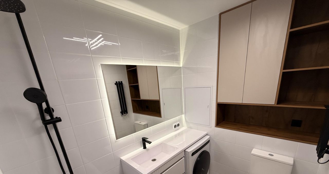 В совмещенный санузел постарались уместить по максимуму мест для хранения, понимаем, как это может быть важно: встроенный шкаф в нише, выдвижные тумбы под раковиной и места хранения за съемным экраном под ванной. Также в квартире современная стиральная машина с сушкой и электрический полотенцесушитель.