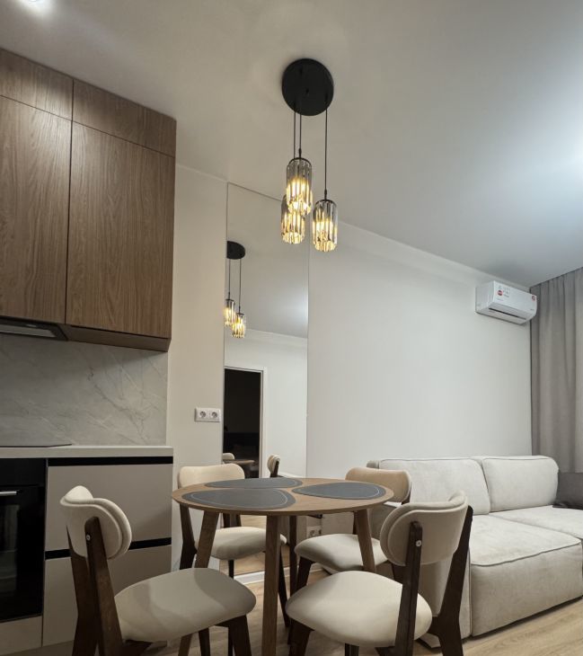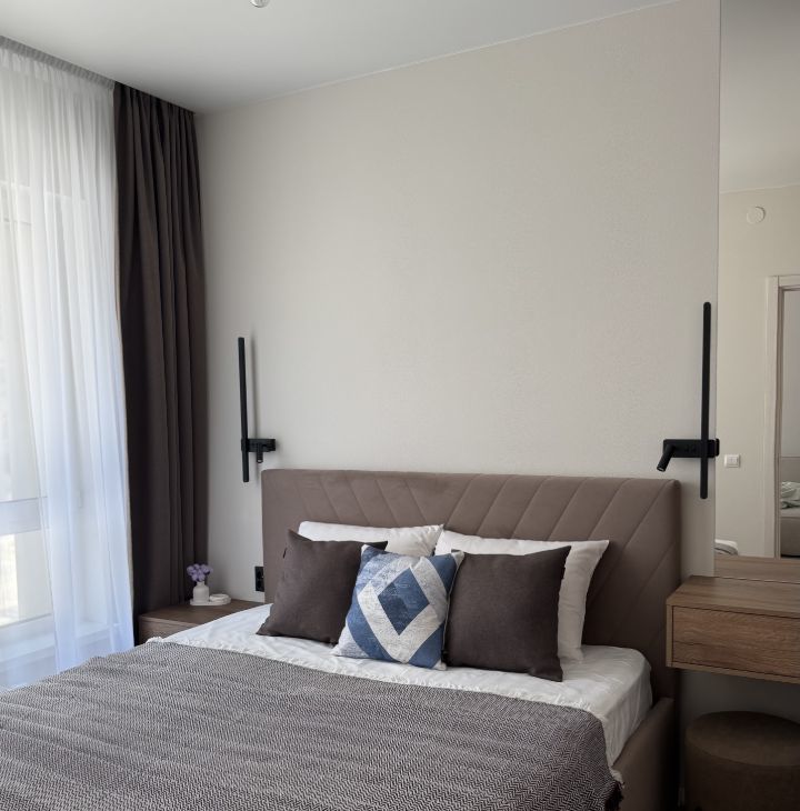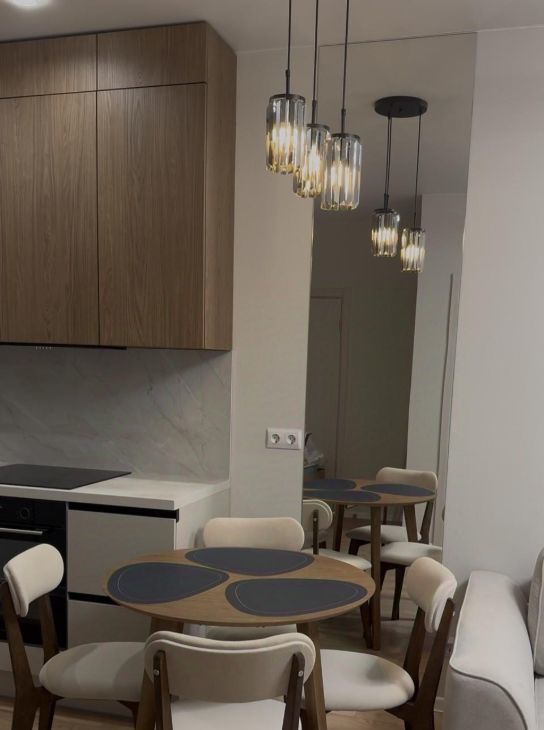 Квартира оснащена всем необходимым для жизни, встроенная техника (духовой шкаф, посудомоечная машина, СВЧ печь, холодильник, варочная панель, вытяжка, стиральная машина) раздвижной диван в гостиной, гардеробная в прихожей, двуспальная кровать с подъемным