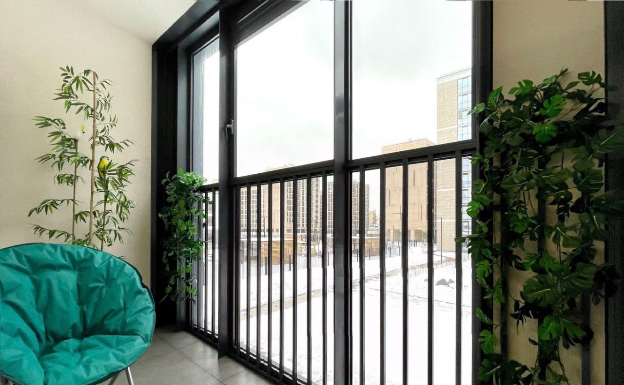 Широкая застекленная лоджия, где можно приятно провести время с чашечкой кофе.