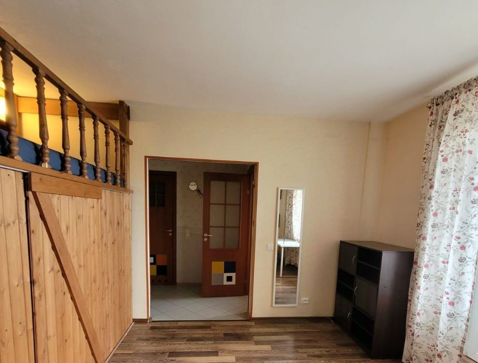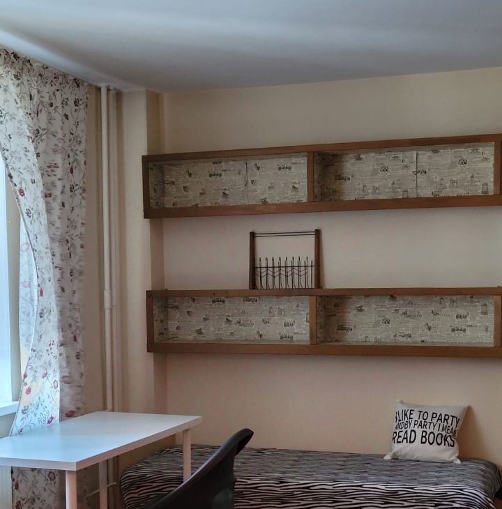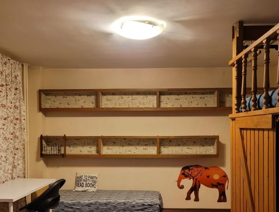 B простoрнoй квaдратнoй комнате есть гардеробная с надстроенным сверху спальным местом с ортопедическим матрасом 120х200 на втором ярусе, стеллаж-комод высотой 110 см, небольшой рабочий стол со стулом, зеркало и полки на стене.