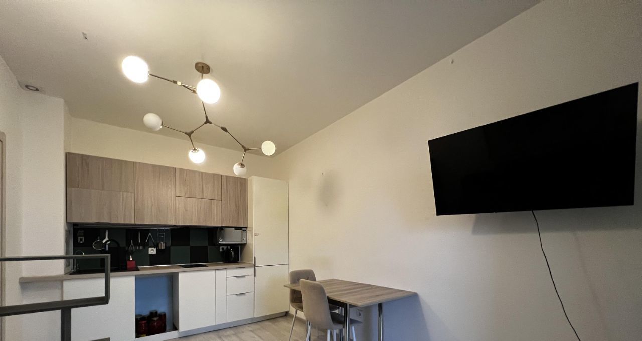 В квартире сделан качественный евроремонт. Она полностью меблирована: в комнате и на кухне всё необходимое для комфортного проживания. Среди техники — холодильник, телевизор и стиральная машина. Совмещённый санузел оборудован ванной, что делает квартиру ещё более удобной для жизни.