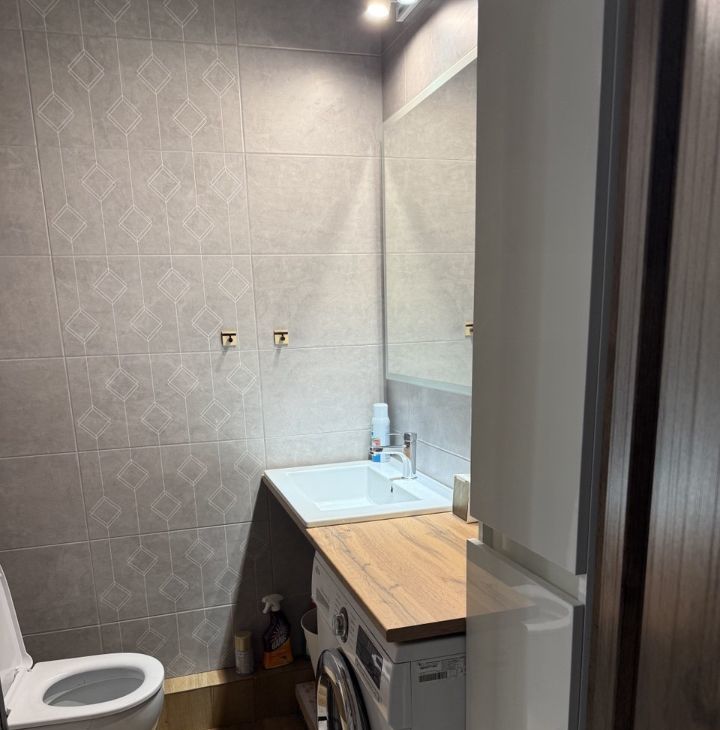 В квартире установлен кондиционер, что обеспечивает комфортный климат в любое время года. Санузел совмещенный, оснащен современной сантехникой, выложена плитка, встроена стиральная машинка.