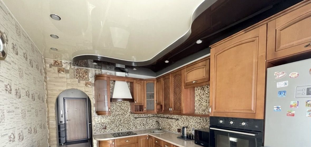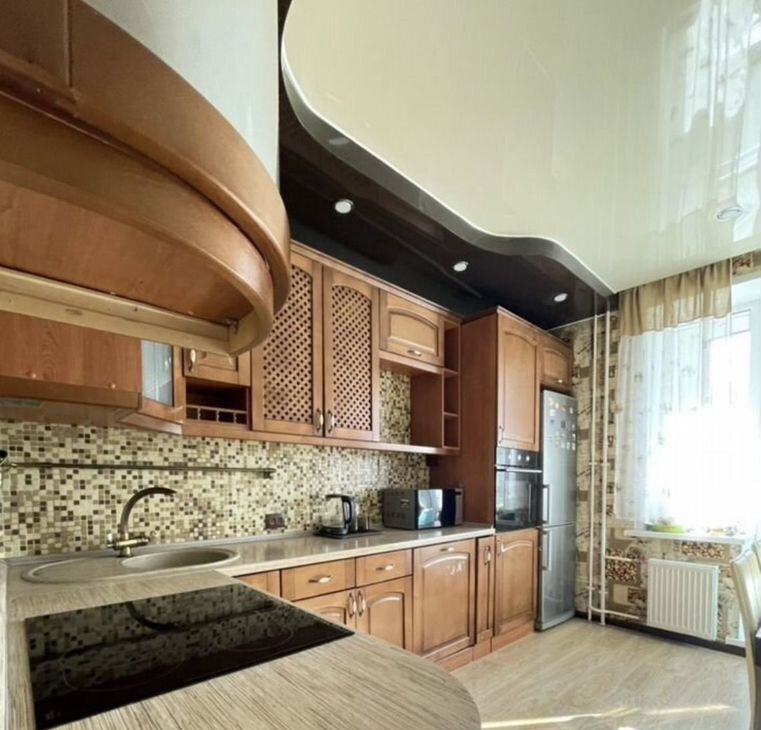 Кухня выполнена в едином стиле и оснащена полным комплектом техники: кухонный гарнитур, холодильник, микроволновая печь, посудомоечная машина, духовой шкаф, варочная панель на 4 конфорки, вытяжка. Обеденная зона со столом и стульями.