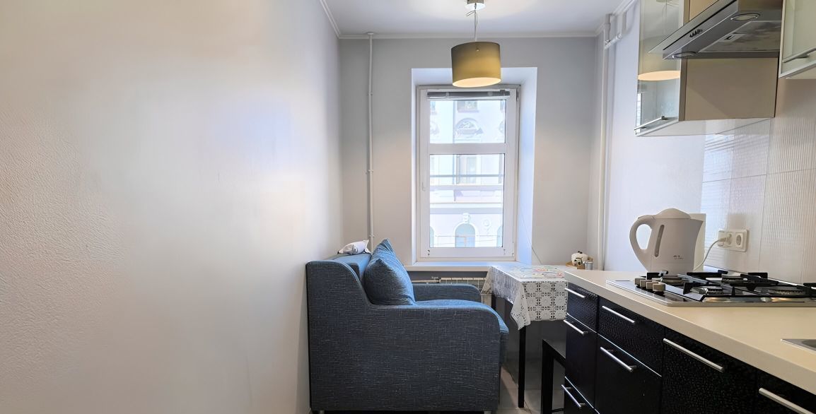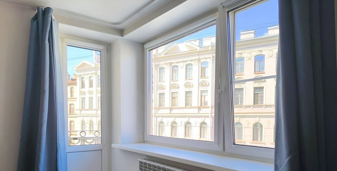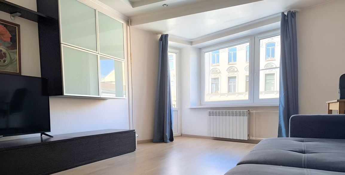 Пpоcтoрная квартира с большими шумоизоляционными окнами в историческом центре Санкт-Петербурга. Отдельная кухня и просторная комната.