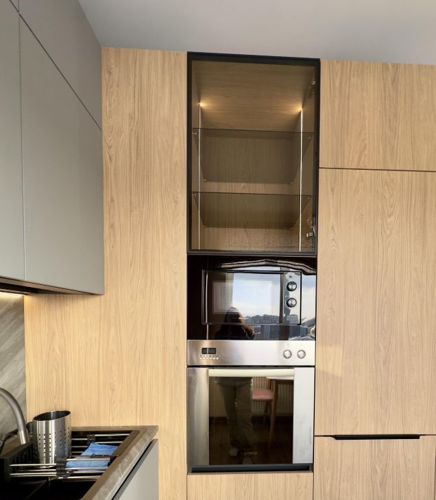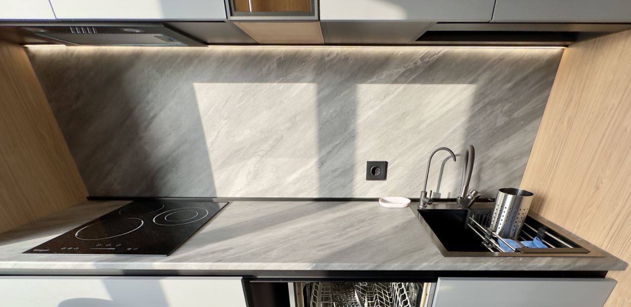- солнечной, современной кухни, укомплектованной посудомоечной машиной (45 см), микроволной печью, варочной панелью, вытяжной системой;
