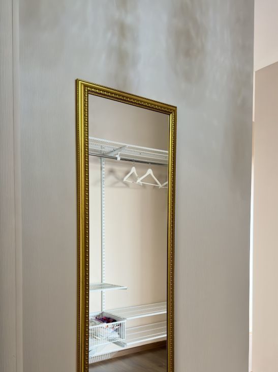 Места для хранения вещей эргономично расположены: в спальне 6-ти секционный шкаф в поток и в прихожей невесомая гардеробная система.