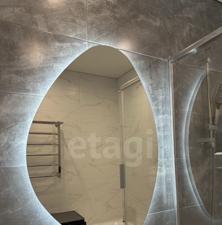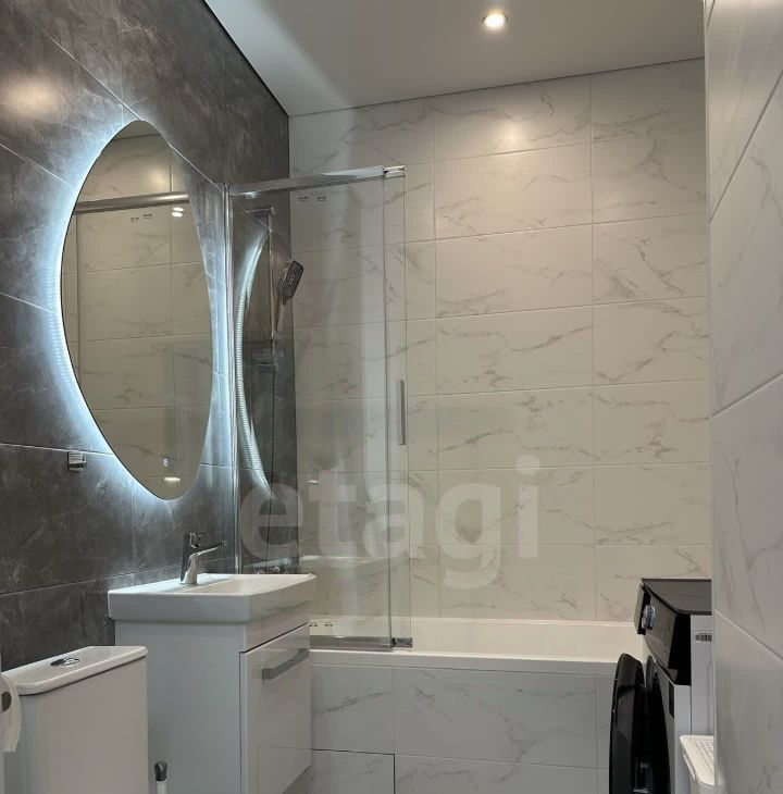 Просторная ванная комната с продуманной системой для хранения тумба под раковинной, стиральная машинка, полотенцесушитель, зеркало с подсветкой.