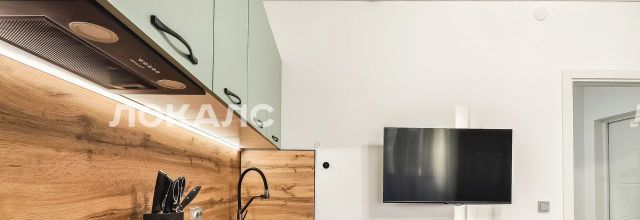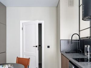 Кухня-гостиная вдоль одной стены оборудована гарнитуром со встроенной техникой: варочной поверхностью, духовым шкафом, вытяжкой, мойкой и фильтром для воды, посудомоечной машиной, а также полноразмерным холодильником и СВЧ-печью. В гостиной части - удобный диван, обеденный стол и четыре мягких стула, на стене установлен телевизор, за дверью - ручной пылесос.
