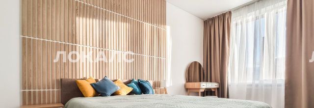 В спальне - удобное бескомпромиссное спальное место - кровать, дополненная прикроватными тумбами, комодом, туалетным столиком, а также напольным зеркалом и вместительным шкафом. Напротив кровати на стене установлен современный телевизор.
