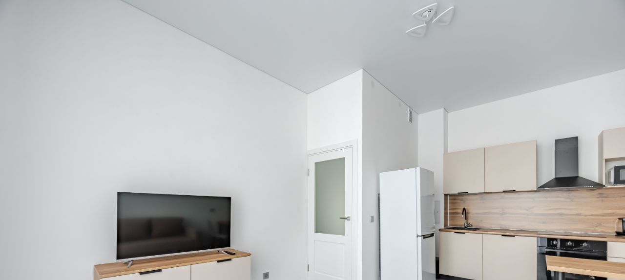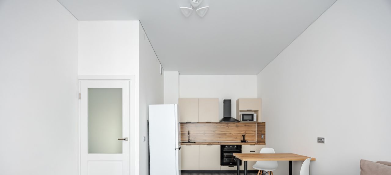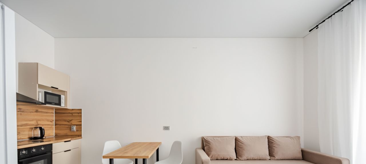 Просторная кухня-гостиная, изолированная спальня.