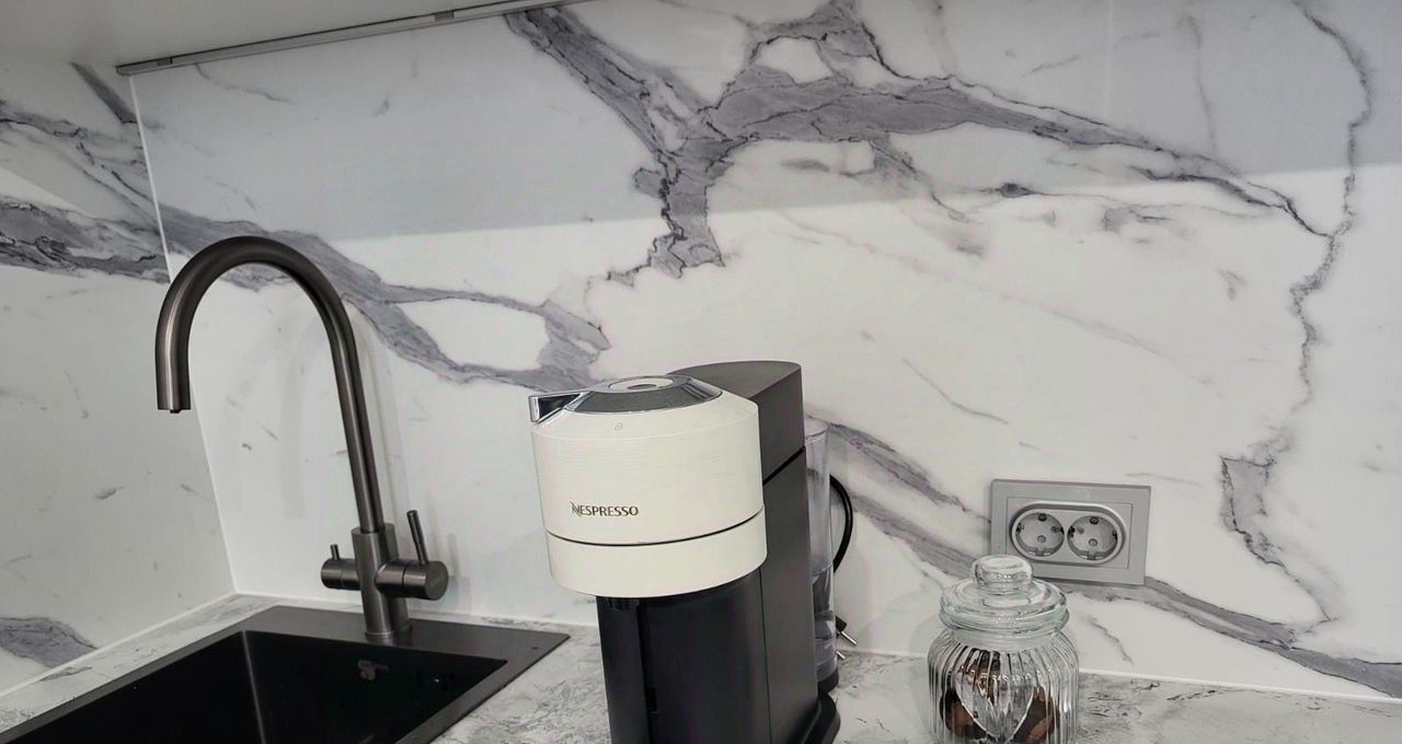 Полностью оборудованная кухня: индукционная плита, посудомоечная машина, холодильник, микроволновая печь и капсульная кофемашина Nespresso Vertuo для идеального кофе.
