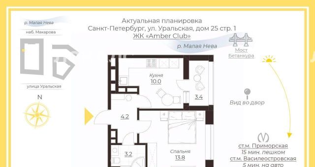 Квартира расположена в современном жилом комплексе высокого комфорт-класса в Василеостровском районе с закрытой территорией. В пешей доступности — магазины и кофейни. Удобный выезд на ЗСД, до ближайшей станции метро Приморская можно дойти пешком за 15 минут, что позволяет быстро добраться до центра города, рядом остановки общественного транспорта, гипермаркет Лента. Рядом вся развитая инфраструктура.