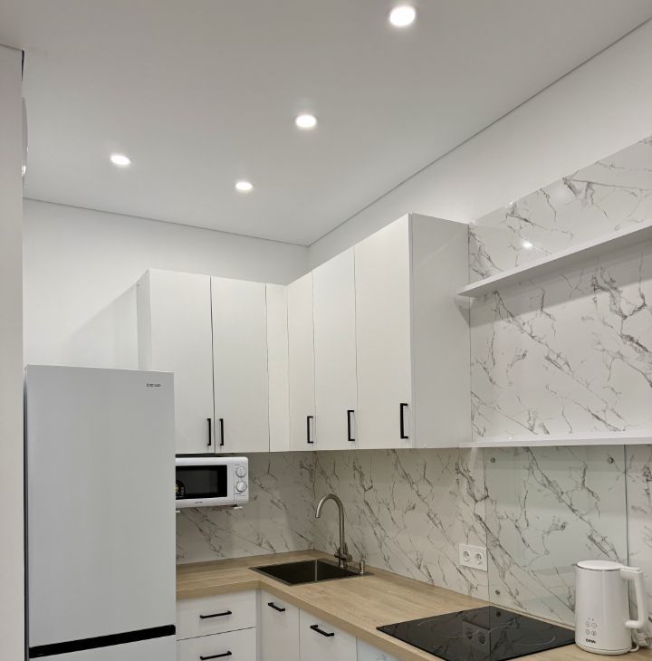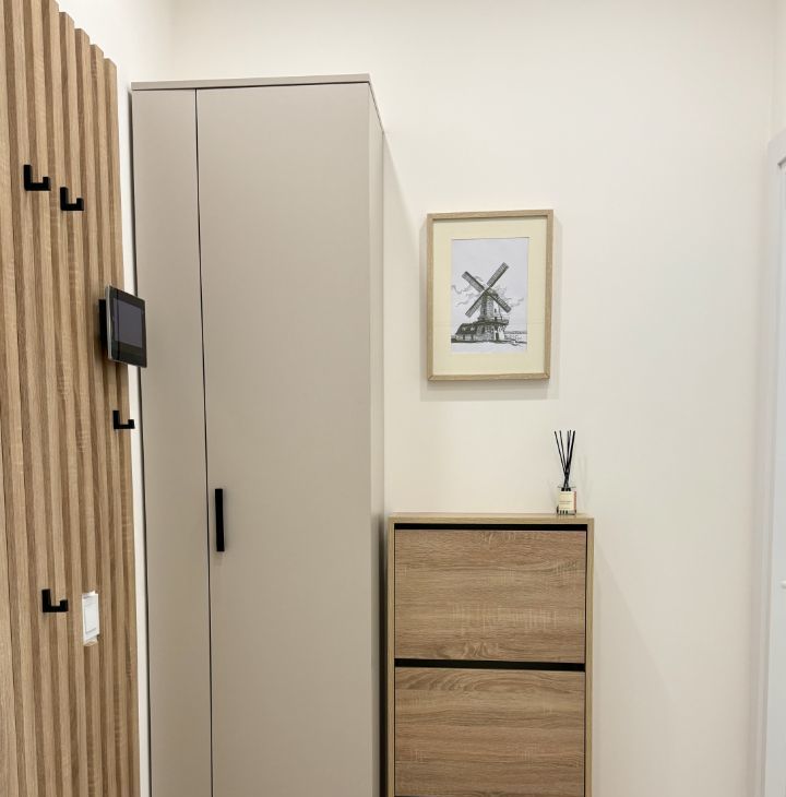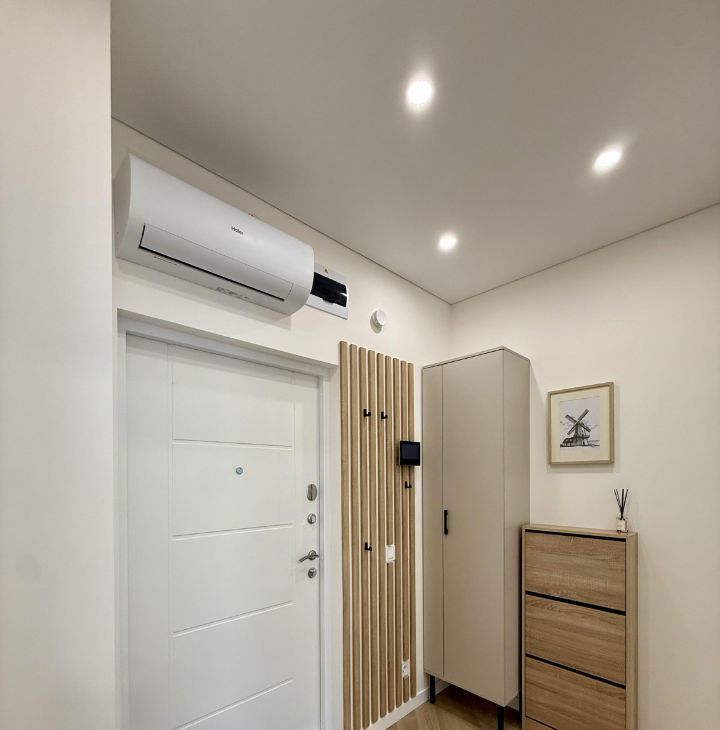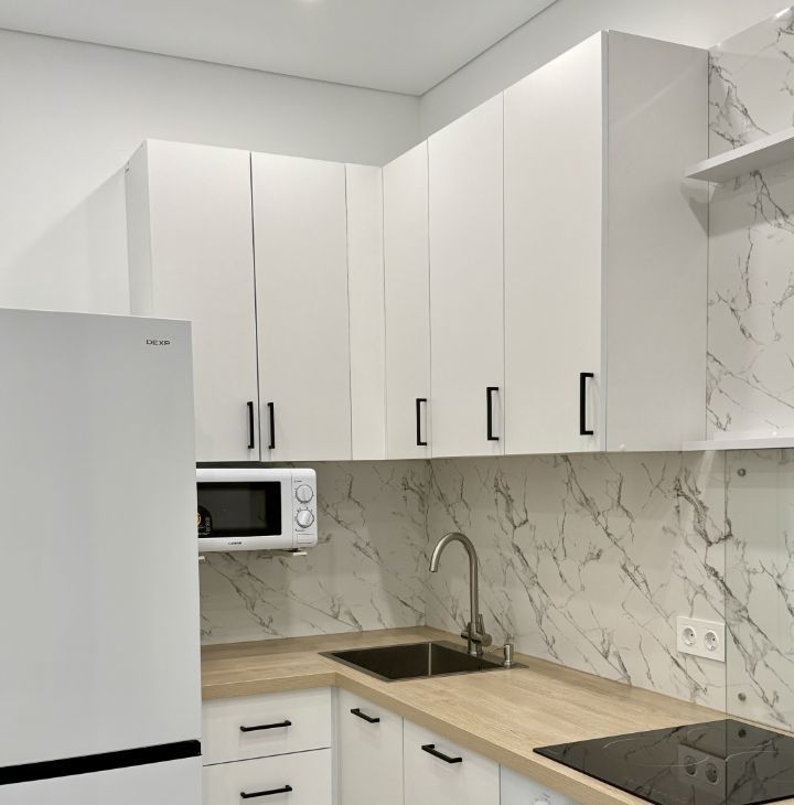 Квартира полностью укомплектована всей необходимой мебелью и техникой: кухонный гарнитур, холодильник, посудомоечная машина, духовой шкаф, варочная поверхность, микроволновая печь, обеденный стол, кондиционер, комод, большая кровать, стиральная машина, вместительный платяной шкаф, прихожая с зеркалом и обувница.