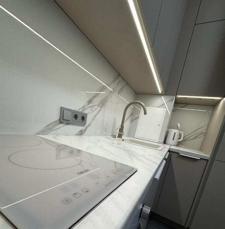 Изюминка квартиры - очень функциональная, умно организованная кухня со встроенным холодильником, посудомоечной машиной и всем необходимым для комфортного приготовления вкуснейшей еды.