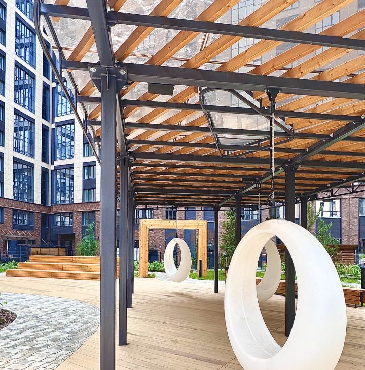 Закрытая территория, подземный паркинг, где также можно снять машиноместо, паркинг во дворе дома, две площадки, одна зона для воркаута, закрытый сквер для прогулок.