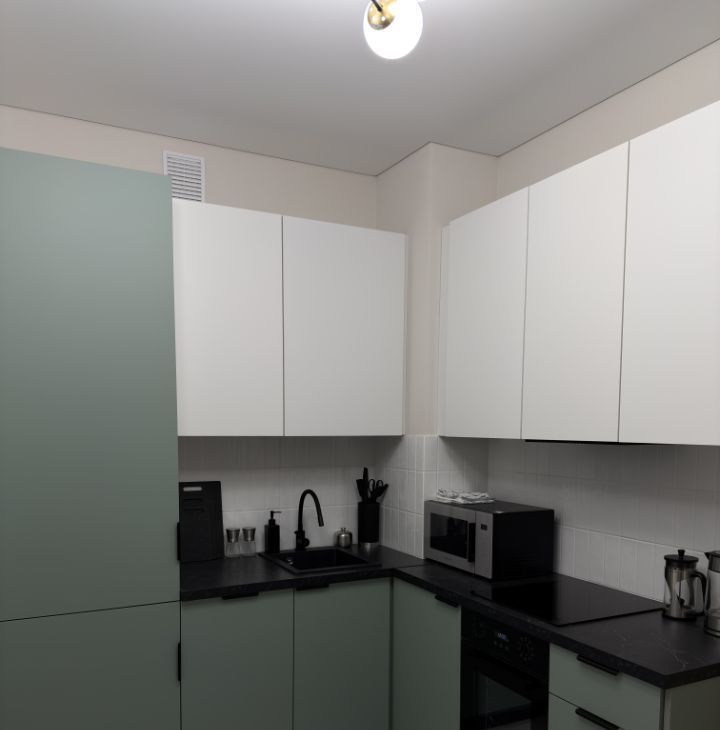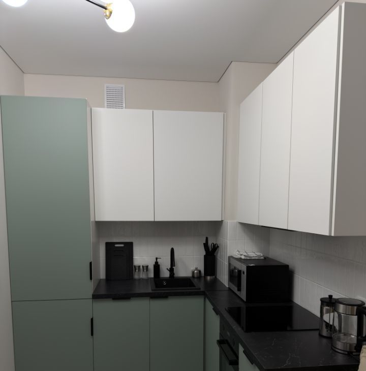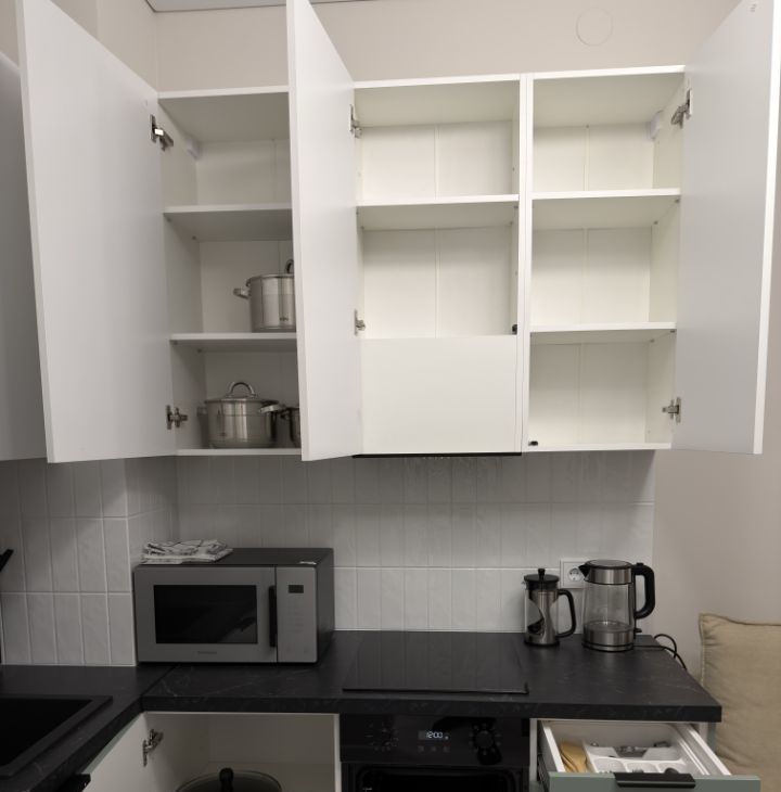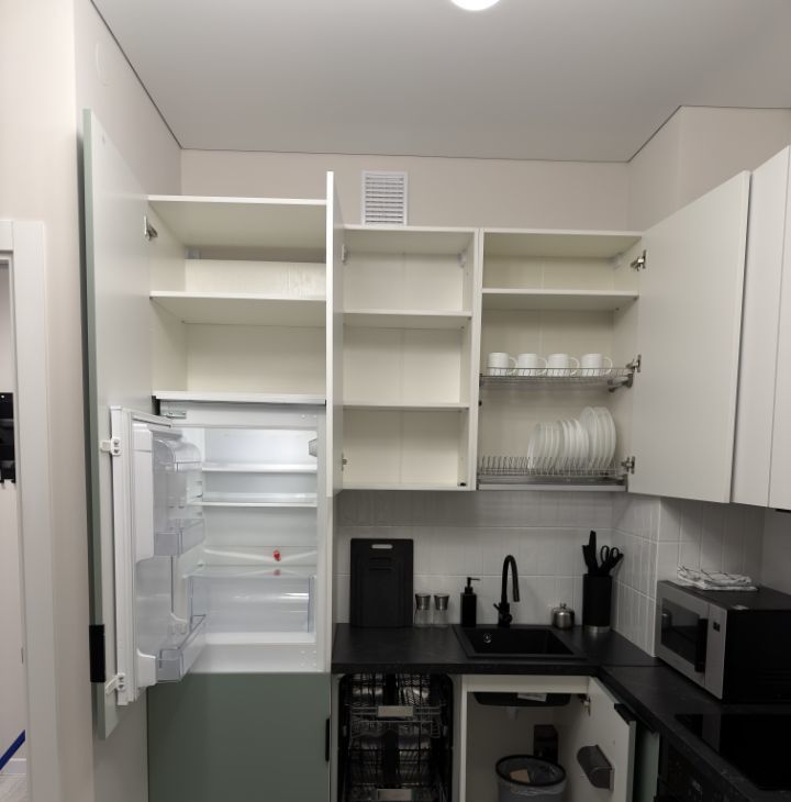 Полноценная кухня, удобная для ежедневного приготовления: варочная панель на 4 конфорки, духовой шкаф, вытяжка, посудомоечная машина, холодильник, микроволновая печь.