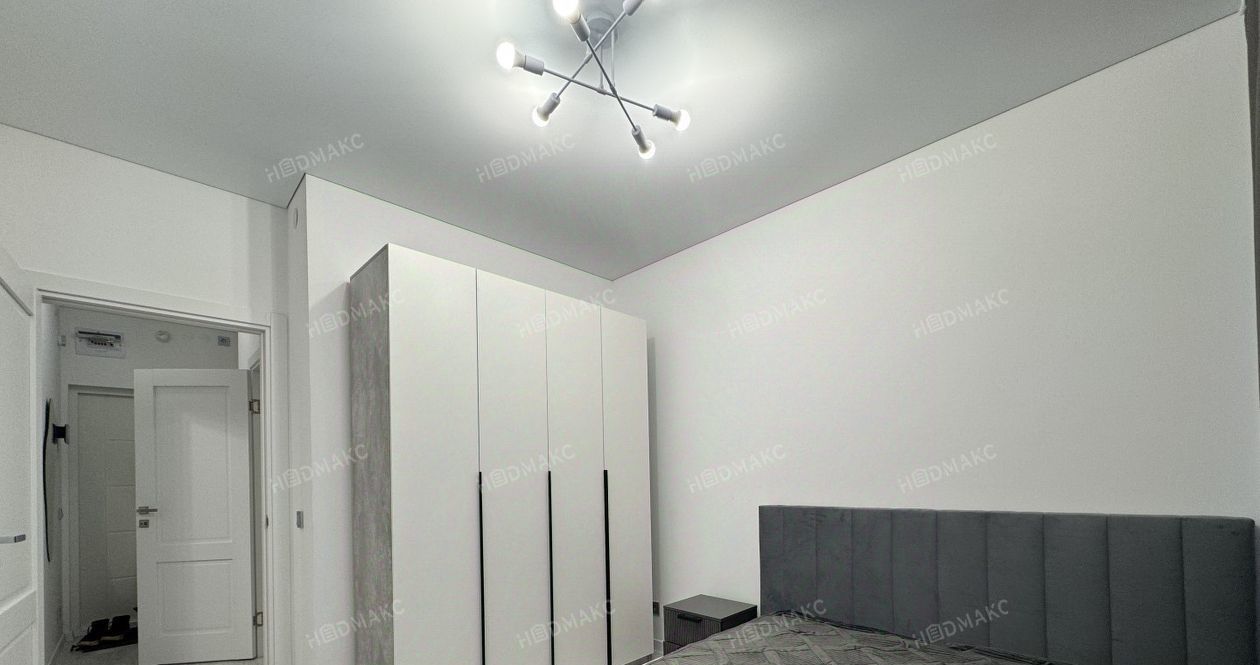 Уютная спальная зона 15 м²: большая кровать 200х160 см с ортопедическим матрасом, вместительный гардероб, подвесной комод, прикроватная тумба.