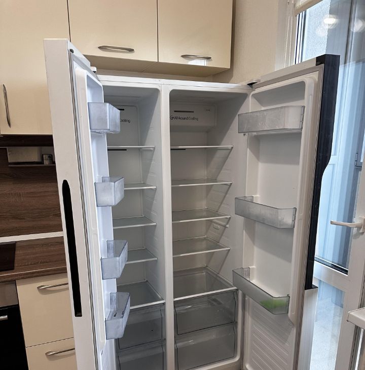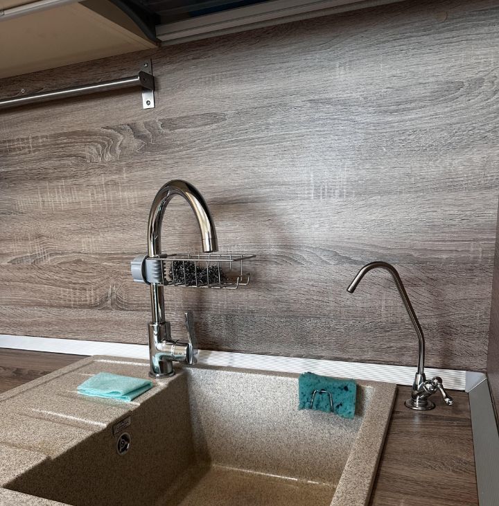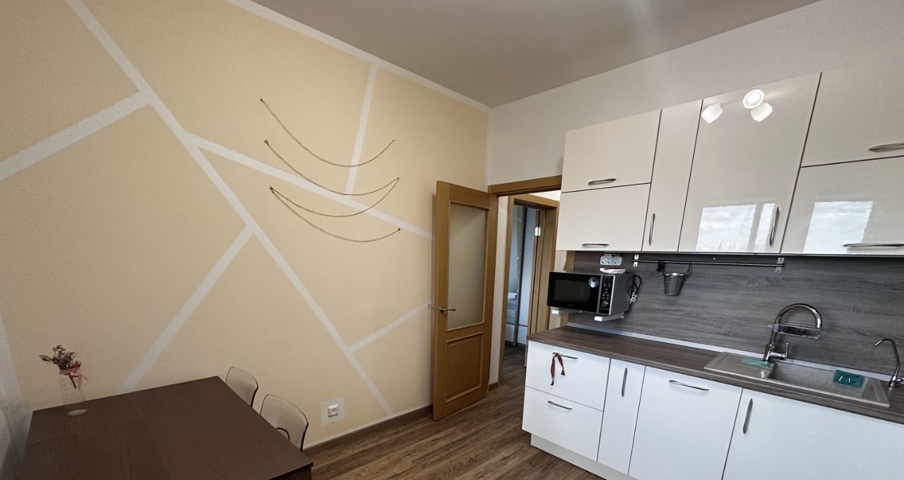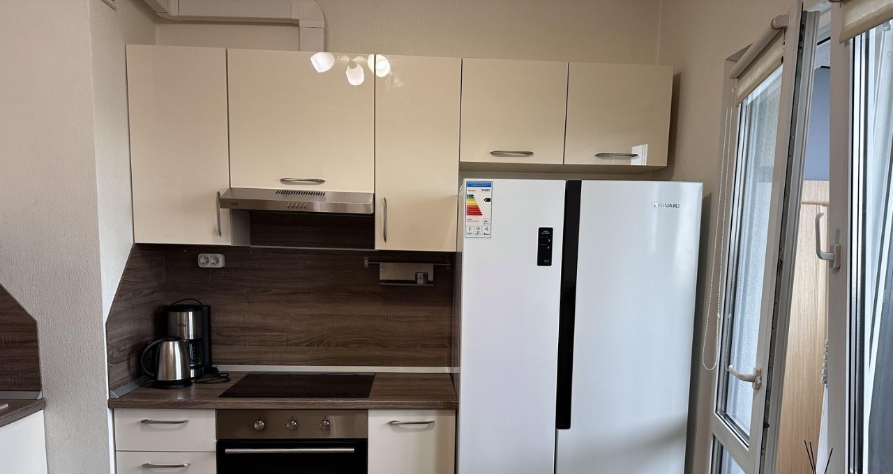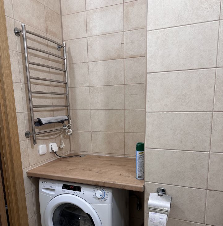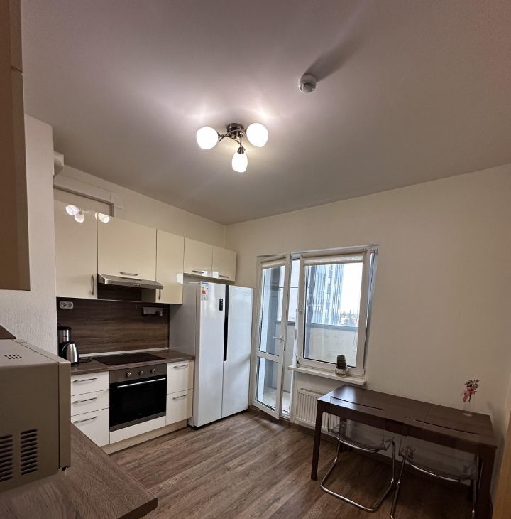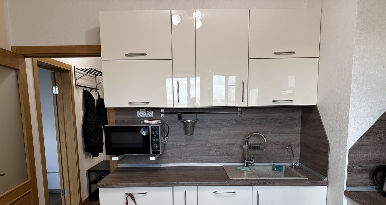 Кухня дорогая, под заказ, 2х дверных холодильник. Стол и 2 стула Икея. Есть чайник, кофемашина, микроволновка, посудомойка, встраиваемая техника, пылесос, утюг, сушилка металлическая, полотенцесушитель.