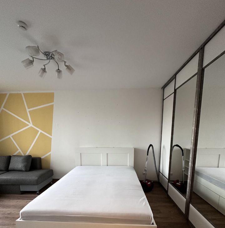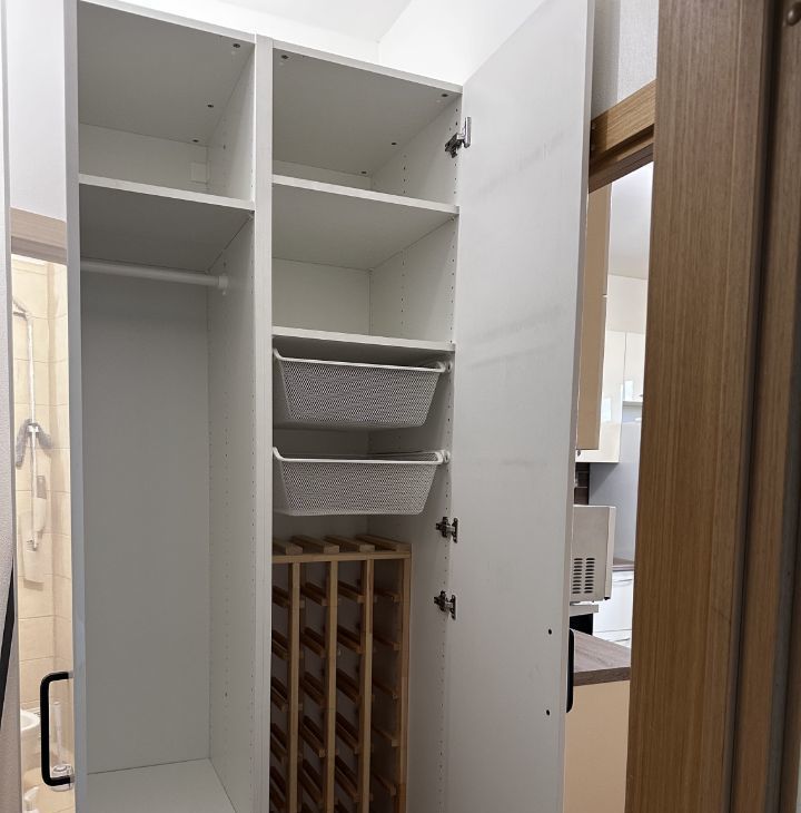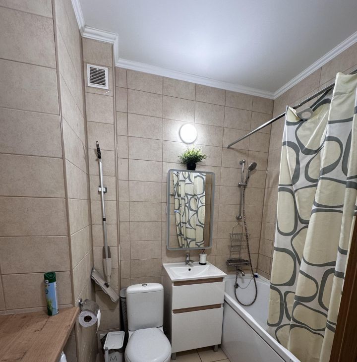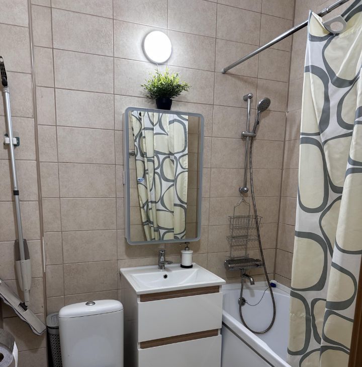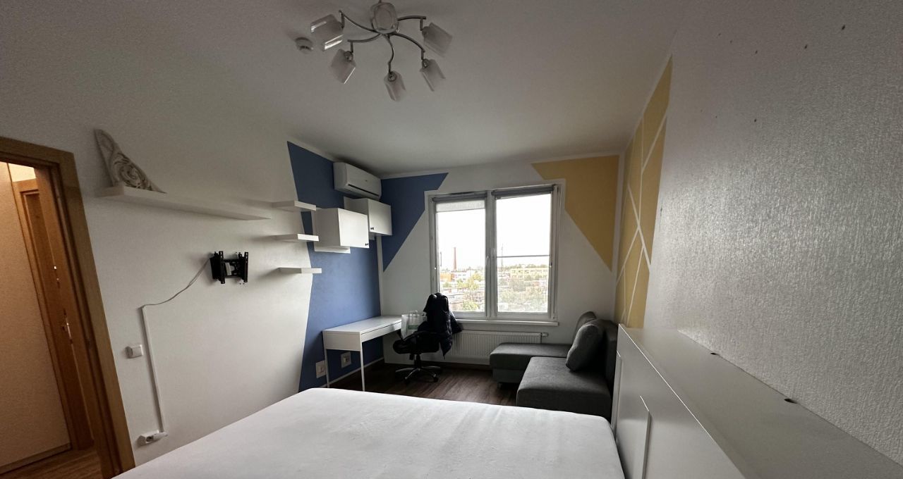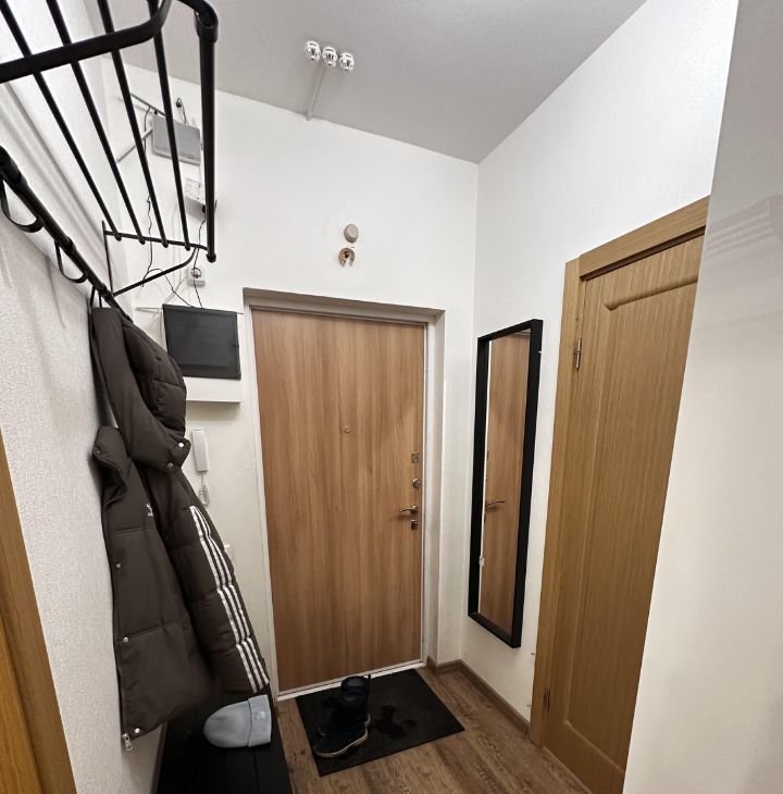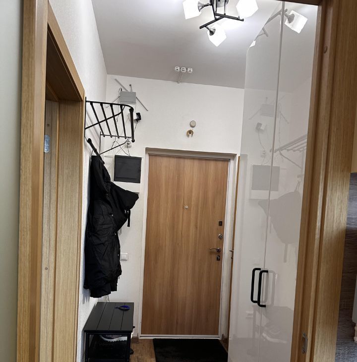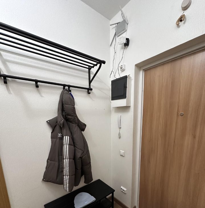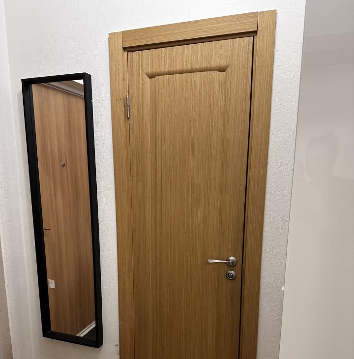 В коридоре шкаф, в шкафу барные полки, обувница, для одежды, зеркало - все Икея. С/у общий, новая стиралка, шкафчик с подсветкой и от запотевания, корзина для белья. В комнате от стены до стены встроенный шкаф купе (под заказ), кровать с изголовьем с полочками с розетками и выключателями для светильников, стол, навесные полки и 2 шкафа над столом - все Икея, компьютерное кресло (состояние не очень, можно выкинуть, если есть свое). Кондиционер, новый, работают на охлаждение и обогрев, мощный до -25С.