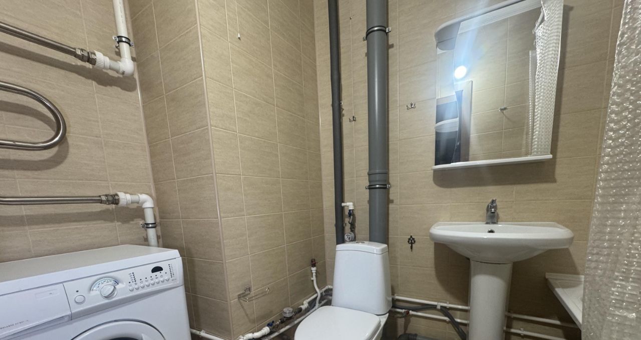 Ванная комната совмещенная, санузел, ванна, раковина и стиральная машина.