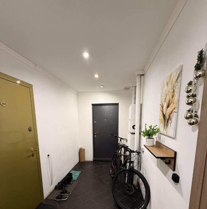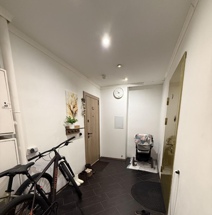 С соседями напротив имеется собственный тамбур-прихожая закрытая металлической дверью. В нем можно оставлять велосипеды, коляски, обувь и тд.