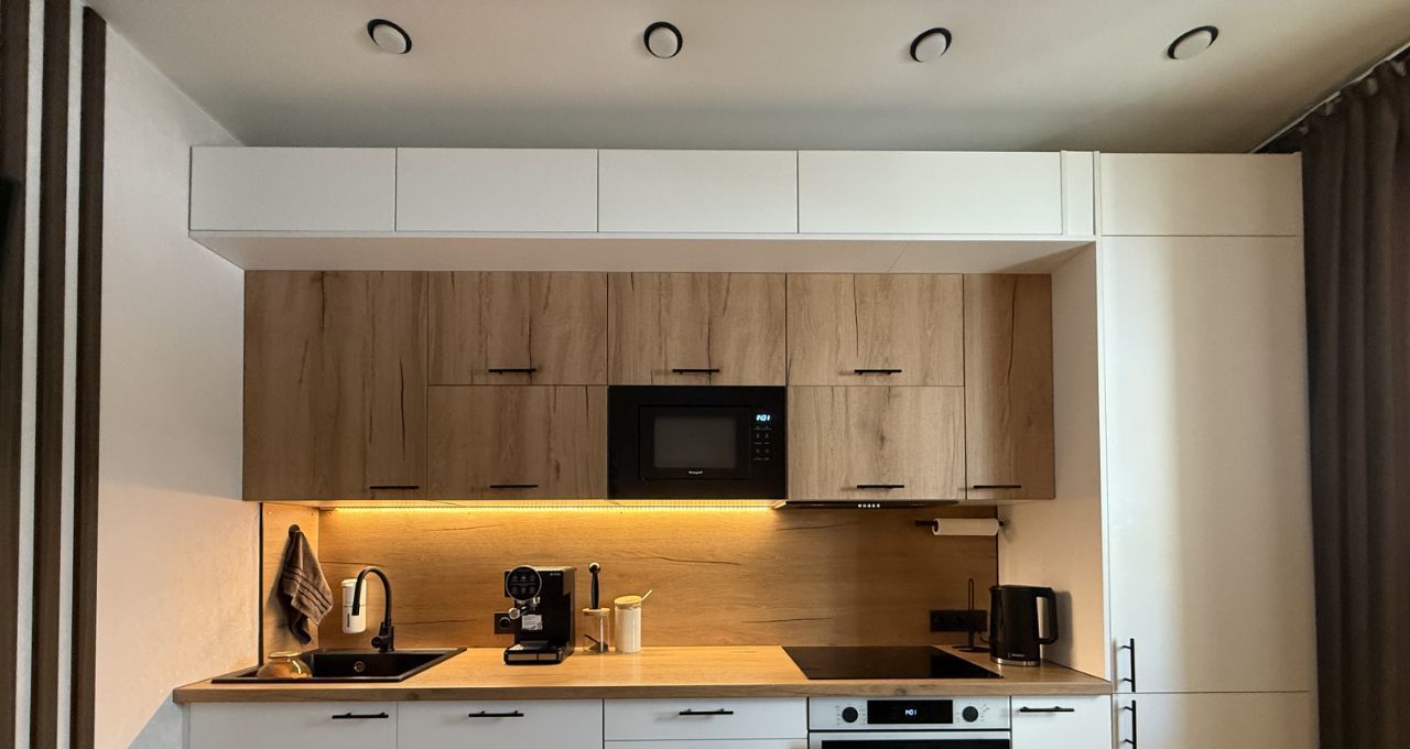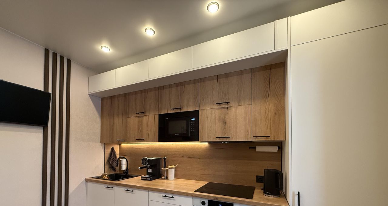 Посудомоечная машина и духовой шкаф - DeLonghi, варочная панель и холодильник - Hansa, микроволновая печь - Weissgauff. Вся кухонная техника встроенная.