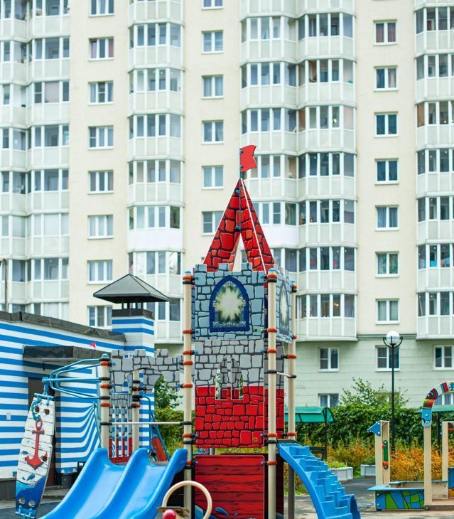 Дом рассчитан на комфортное и безопасное проживание: аккуратные парадные, три лифта (пассажирский и два грузовых), видеонаблюдение по периметру, консьерж. Во дворе — современные детские площадки для разных возрастов, спортивные зоны, места для отдыха, зелёные насаждения.