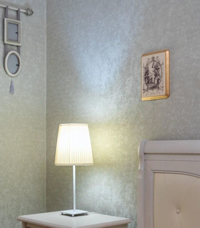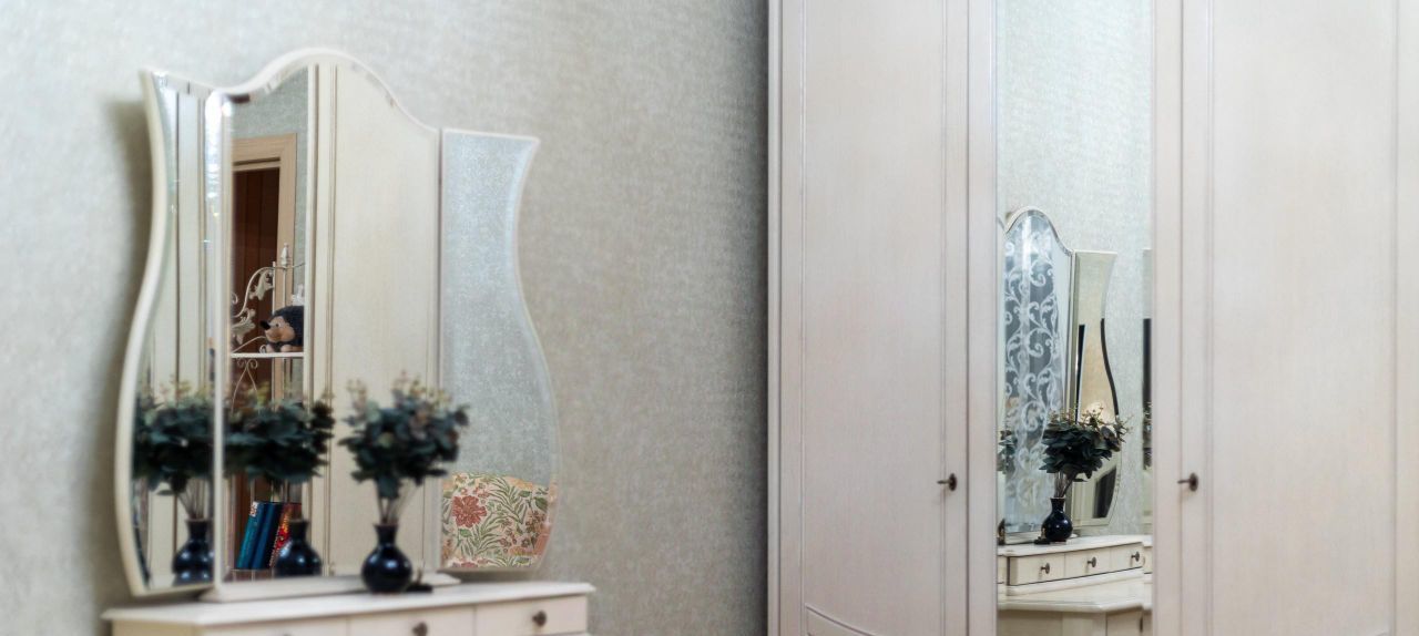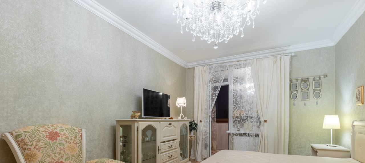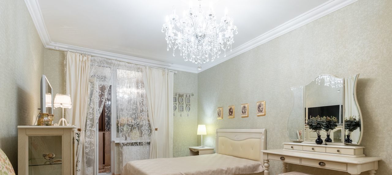 • Спальня оформлена светлой мебелью с изящной резьбой, что усиливает впечатление лёгкости и благородного стиля.