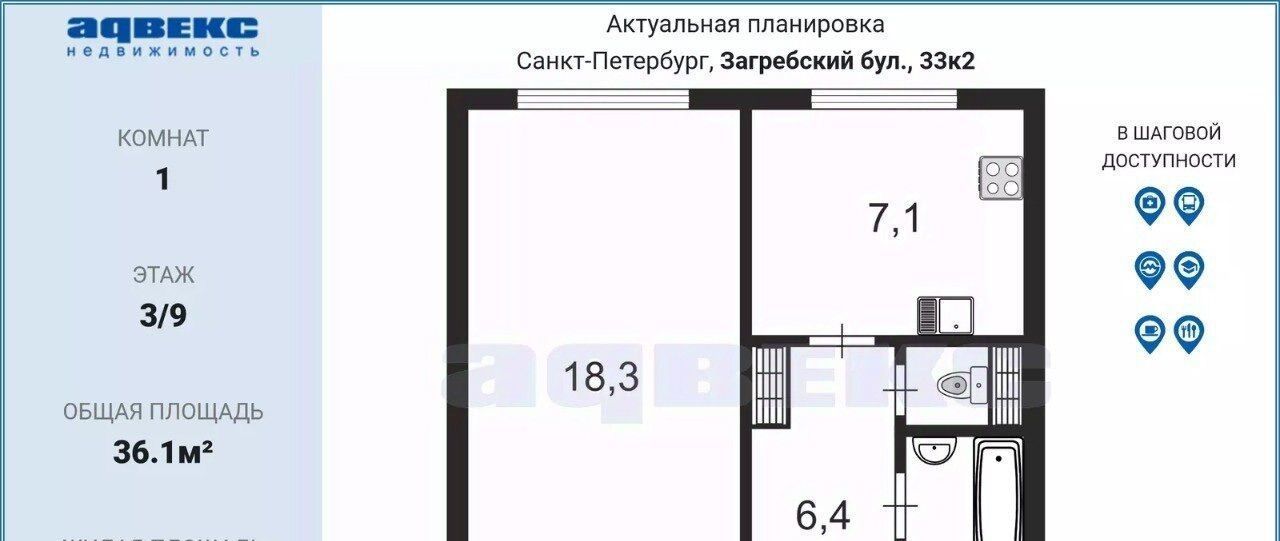 1-к кв. Санкт-Петербург Загребский бул., 33К2 (36.1 м²)