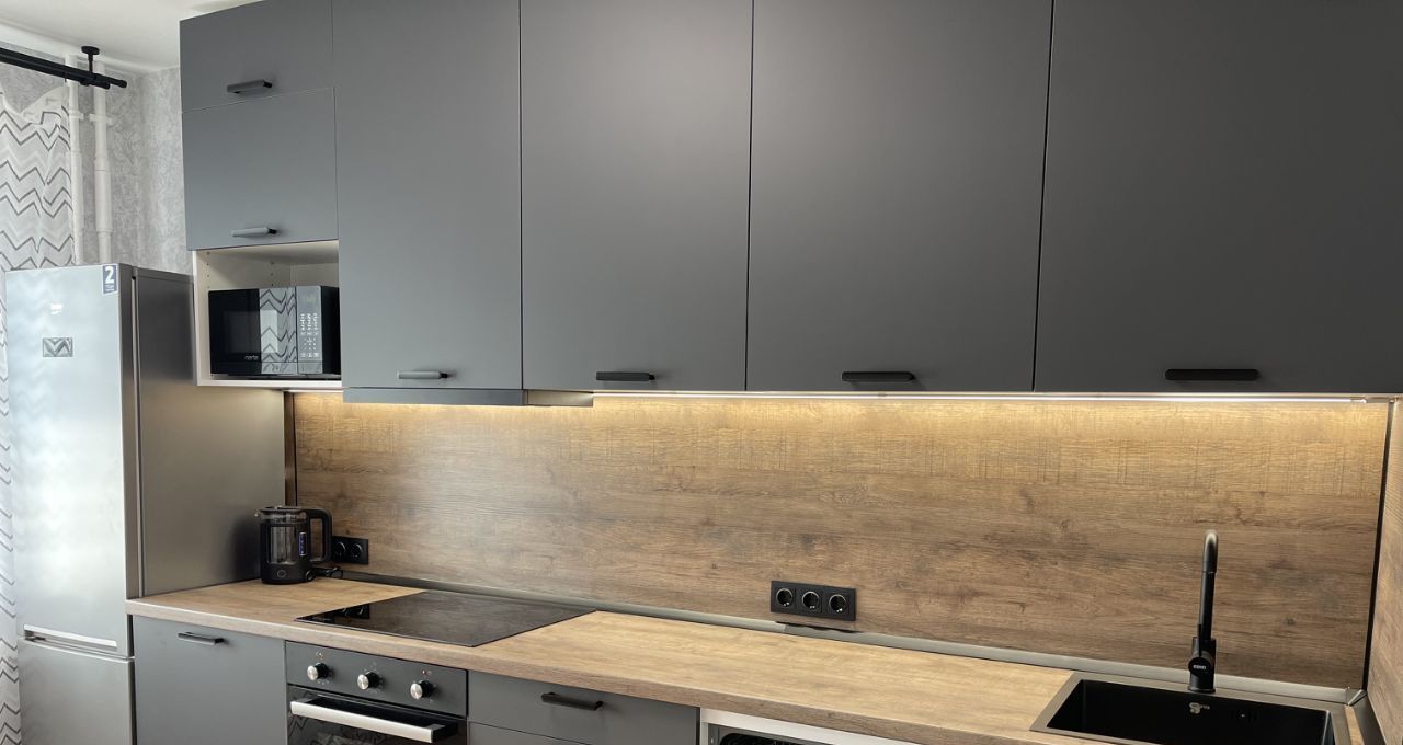 В квартире есть холодильник, микроволновка, чайник, посудомоечная и стиральная машинки, духовой шкаф, варочная поверхность. Вся техника новая. Теплый пол в ванной.