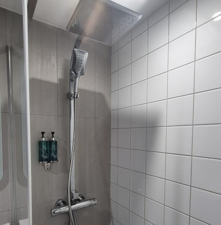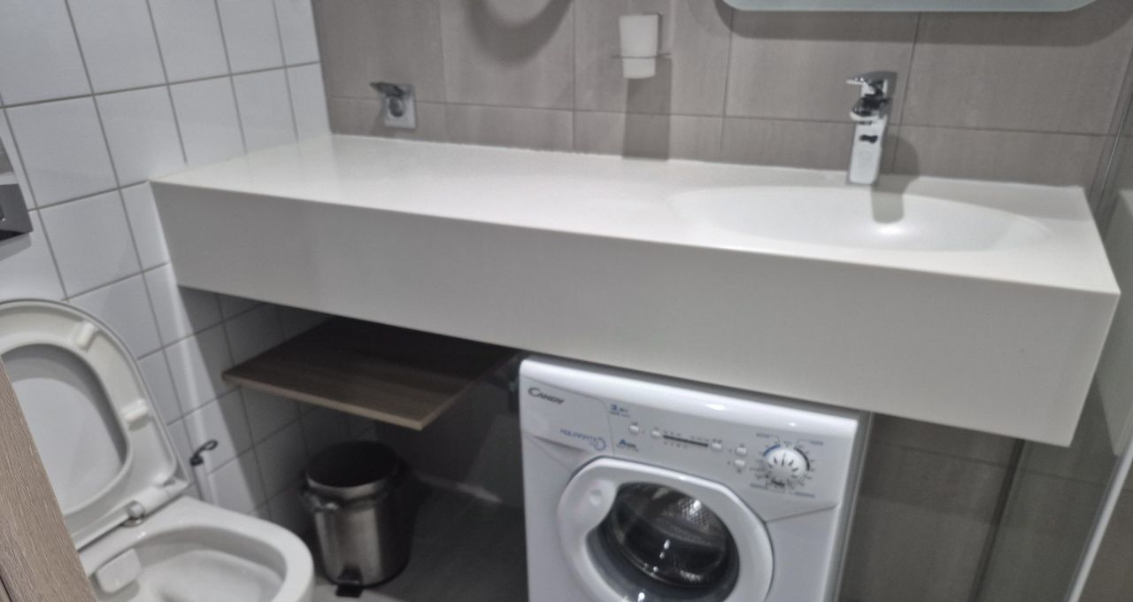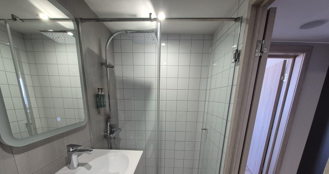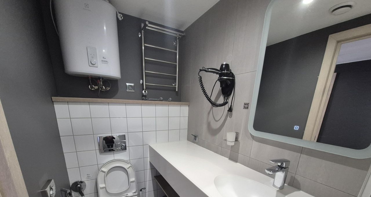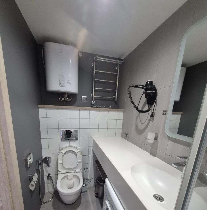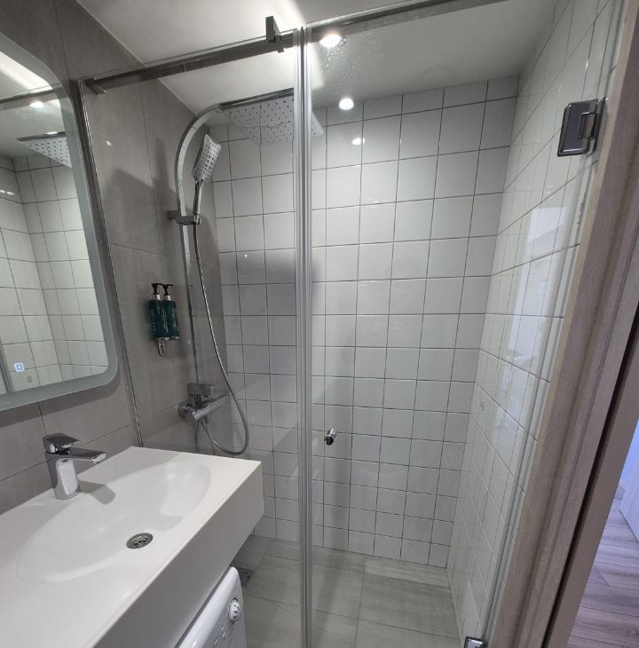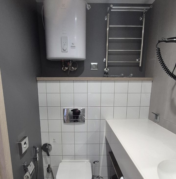 + Ванная комната с душевой кабиной. В ванной комнате установлены стиральная машина и бойлер.