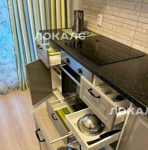Аккуратная кухня с панорамными окнами. Встроенная бытовая техника - индукционная панель, посудомоечная машина, стиральная машина, микроволновая печь, духовой шкаф, холодильник. Качественная мебель, все дверцы и ящики с доводчиками, с подсветкой внутренних полок и рабочей поверхности. Есть все необходимое для комфортного проживания электрический чайник, посуда с новым комплектом тарелок, столовые приборы.