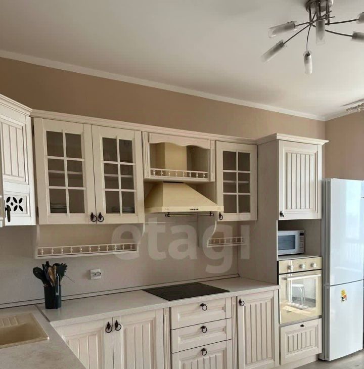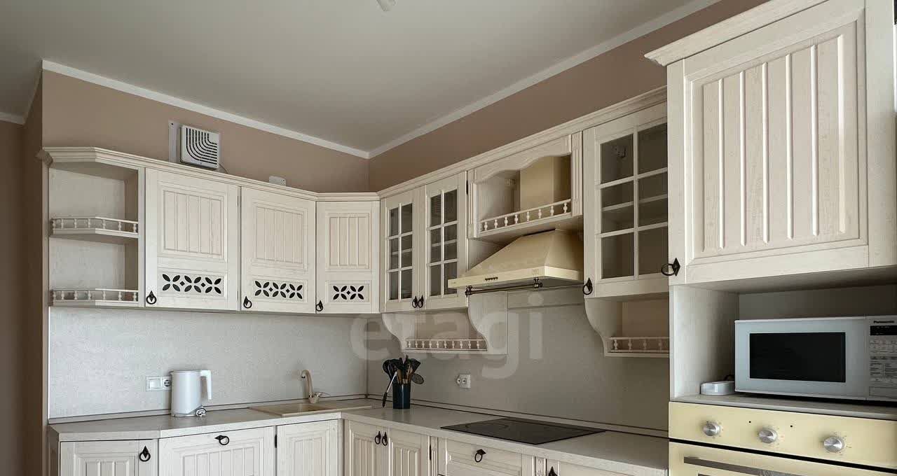 Кухня большая и просторная, имеется полноценный кухонный гарнитур, обеденный стол, стулья, бытовая техника в виде холодильника, варочной плиты, микроволновой печи, духовки, электро чайника.