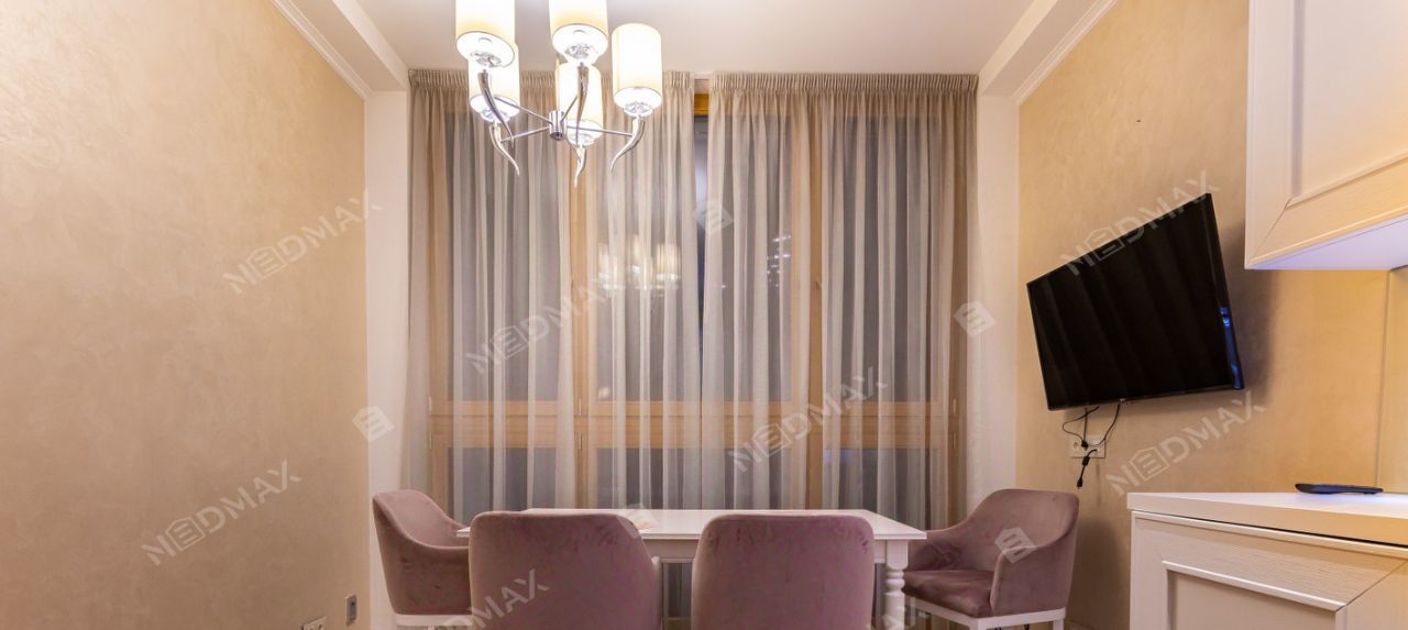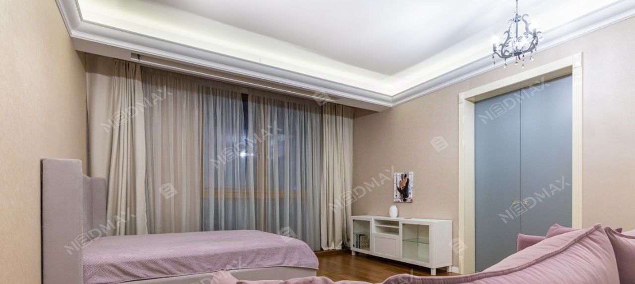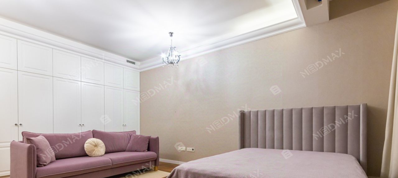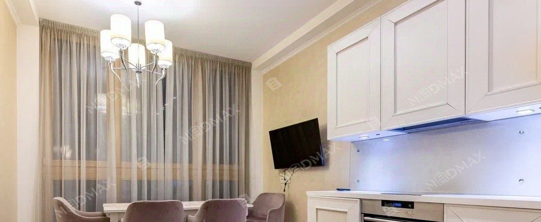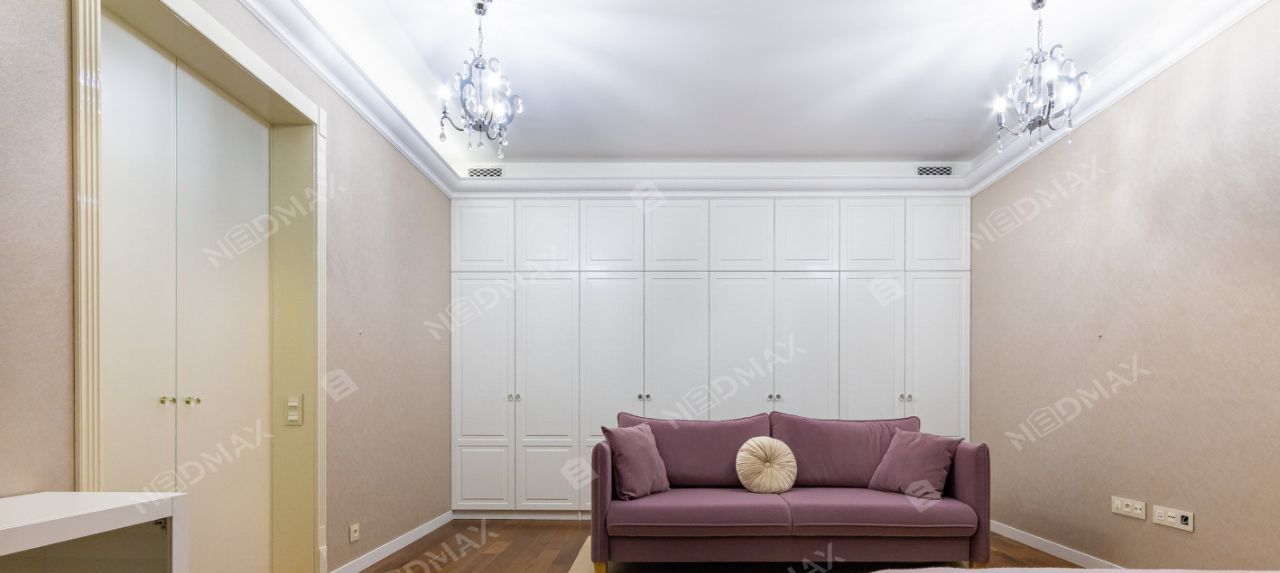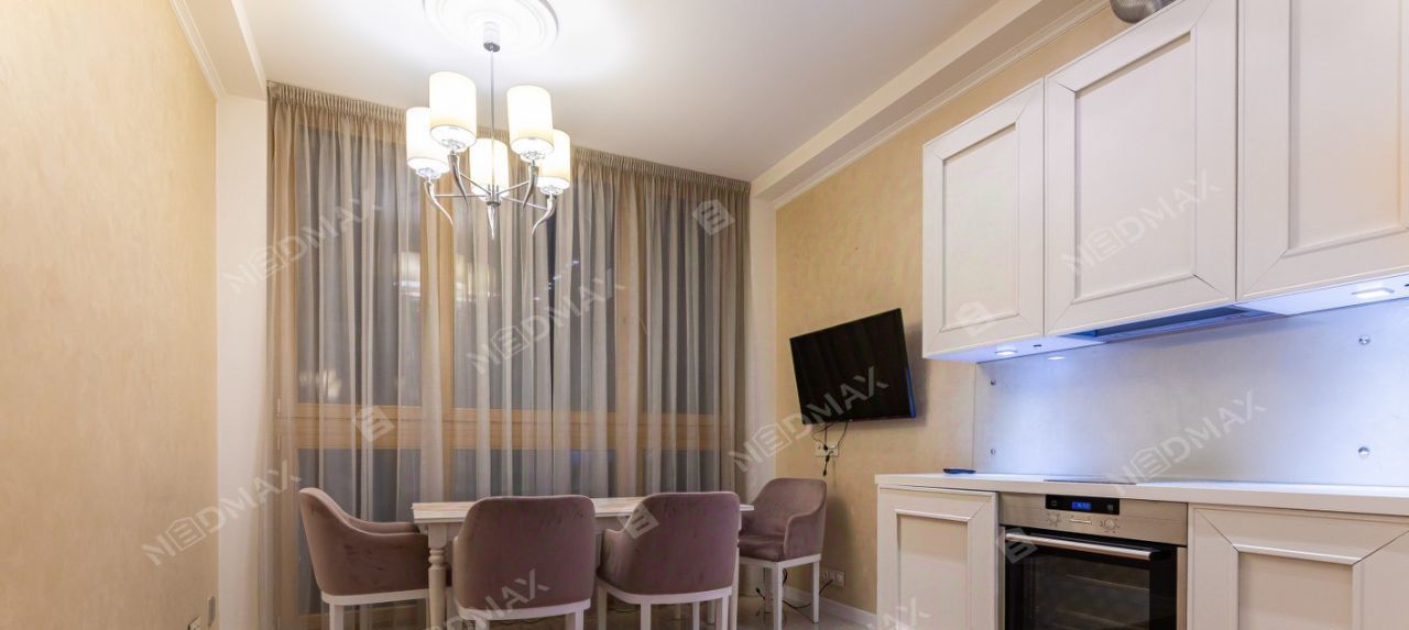 В квартире выполнен качественный евроремонт с использованием дорогих отделочных материалов. Планировка - спальная комната, просторная оборудованная кухня (посуд.машина), санузел с душевой, балкон. Много мест для хранения. Комфортабельная мебель, современная техника. Кондиционер, бойлер, вентилируемые фасады. Высокие потолки 3,1 м с окнами в пол.