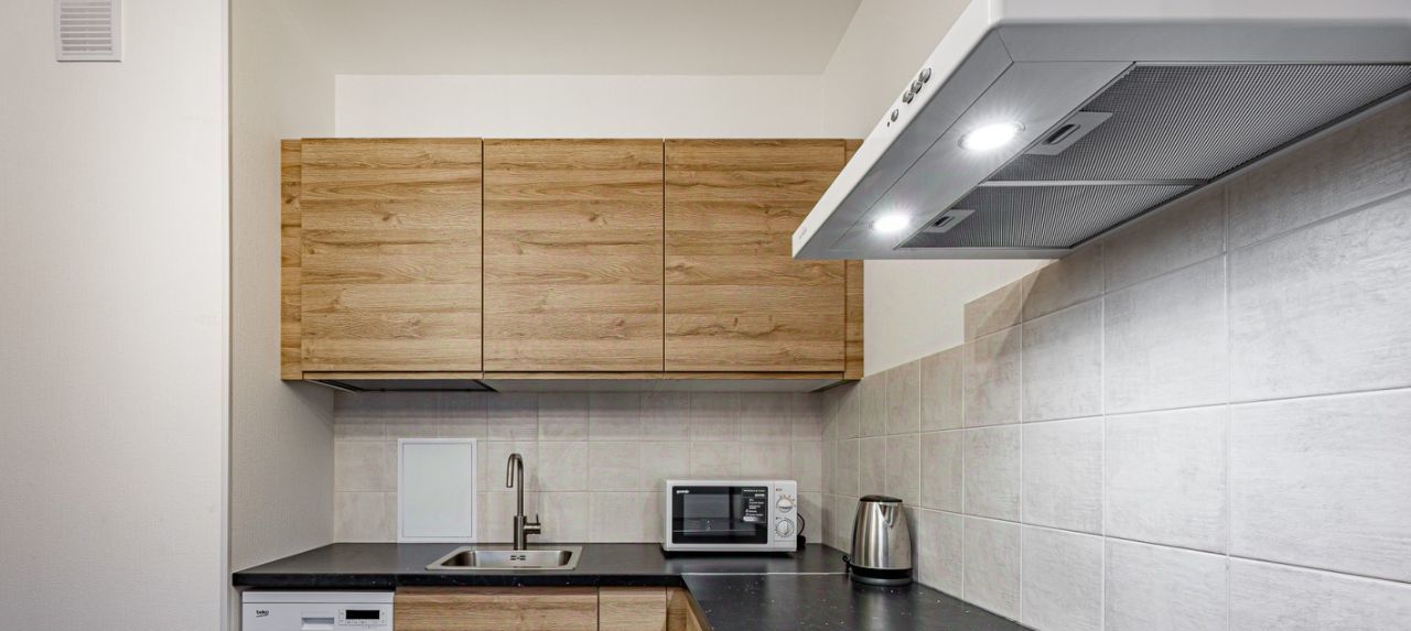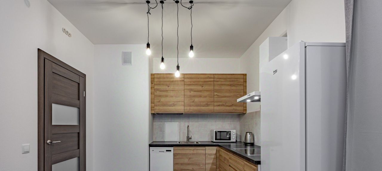 Встроенная кухня с бытовой техникой, включая посудомоечную машину.
