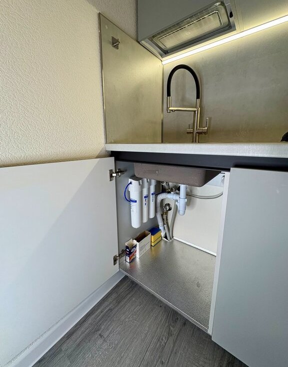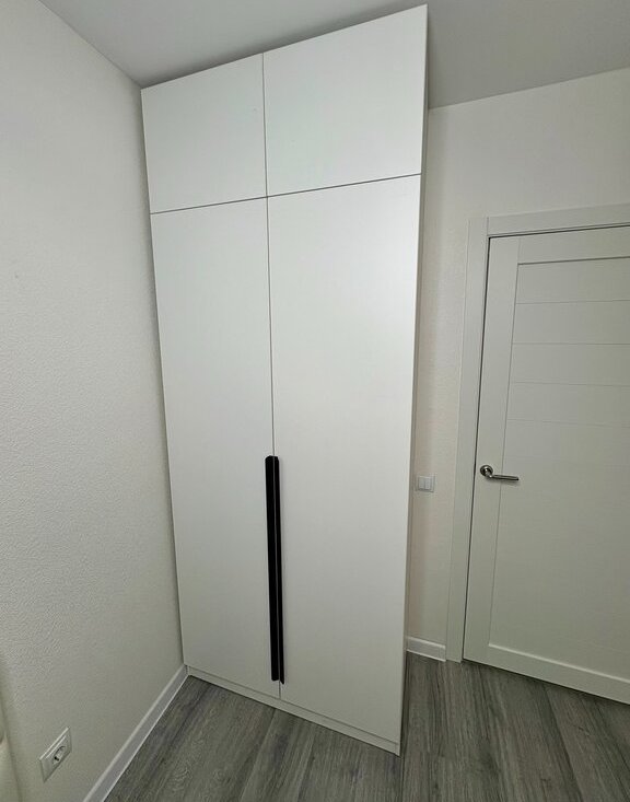 - шкаф под потолок индивидуальный заказ, две дверцы, слева две штанги на разных уровнях, справа хранение вертикальные полки, два откатных ящика закрытых под белье, с нишами под полотенца