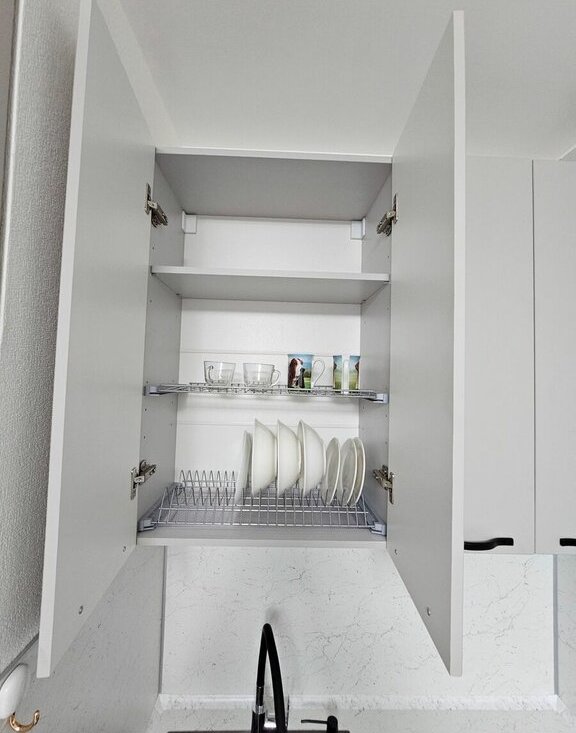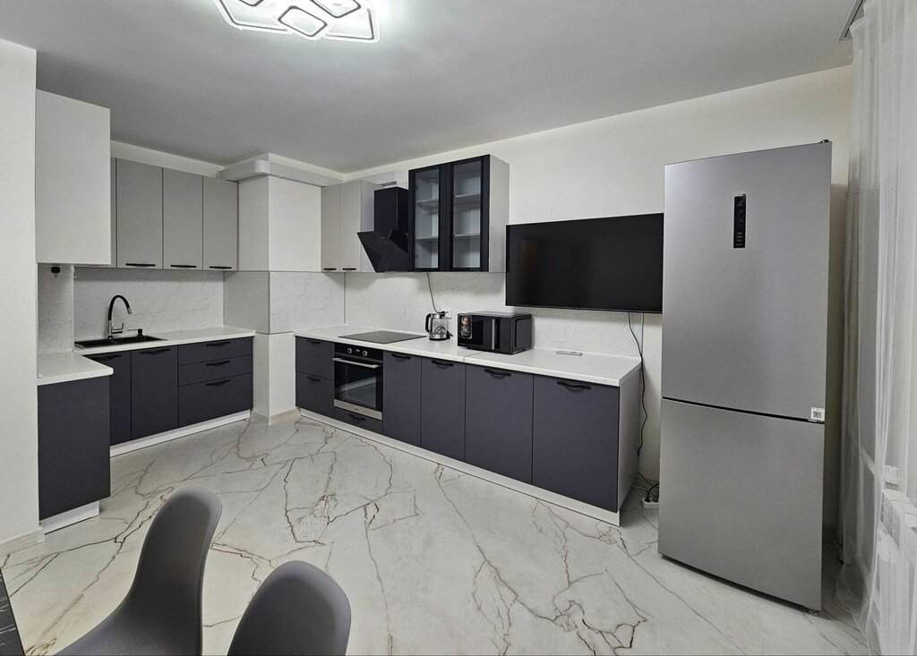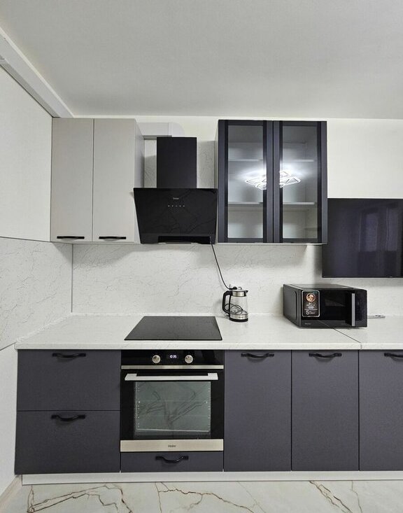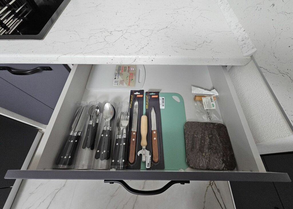 — новый кухонный гарнитур с большим количеством рабочих поверхностей;