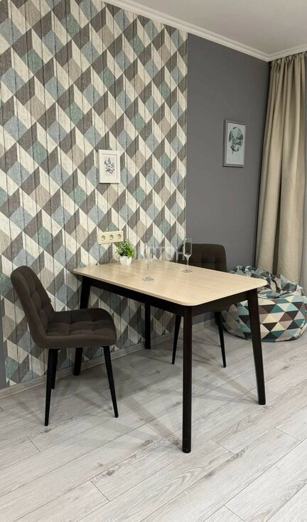 Очень удобная рабочая зона-все логично выстроенно между мойкой,плитой и холодильником.Раздвижной стол-можно комфортно принимать гостей,много розеток,удобные кресла(антивандальная ткань),дополнительный пуфик.