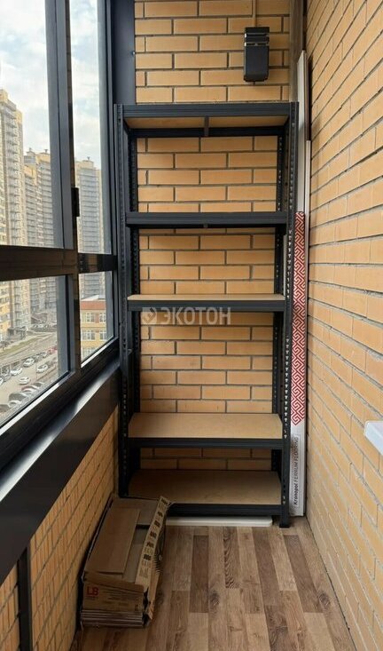 Балкон длинный,функциональный,оборудован стеллажом,помещаются велосипеды,отдельная зона хранения.