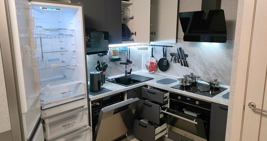 Кухня укомплектована современной техникой, набором посуды для приёма, и приготовления пищи, столовыми приборами и аксессуарами.