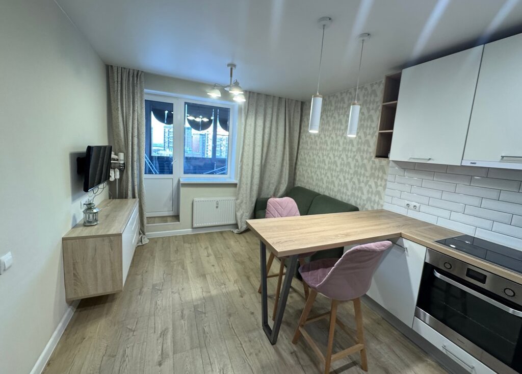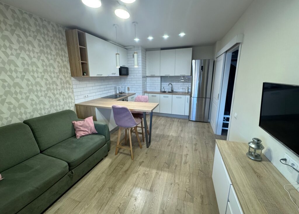 В квартире выполнен свежий ремонт. Просторная кухня-гостиная оборудована необходимой бытовой техникой, включая холодильник, духовой шкаф, плиту и посудомоечную машину. Также установлен телевизор и удобный диван. В квартире есть мелкая бытовая техника и посуда для комфортного проживания.