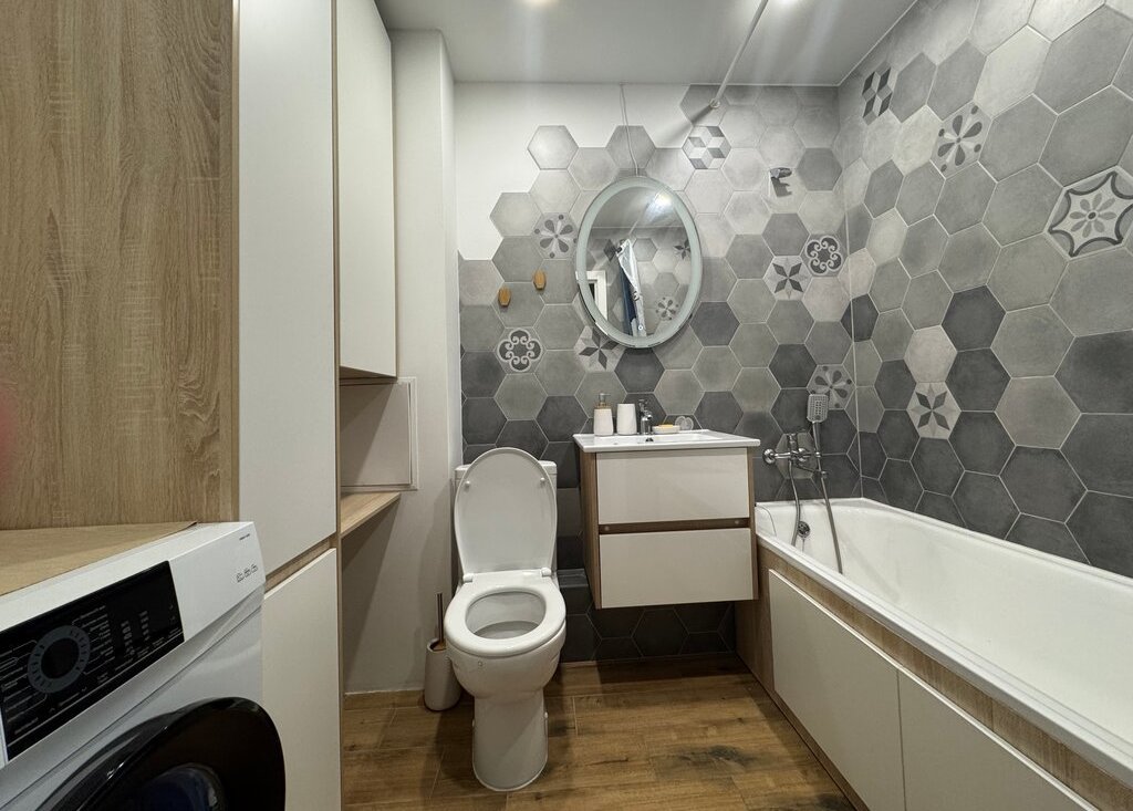 Санузел совмещенный, оформлен стильной плиткой, имеется стиральная машина. Лоджия застеклена , что позволяет использовать ее круглый год.
