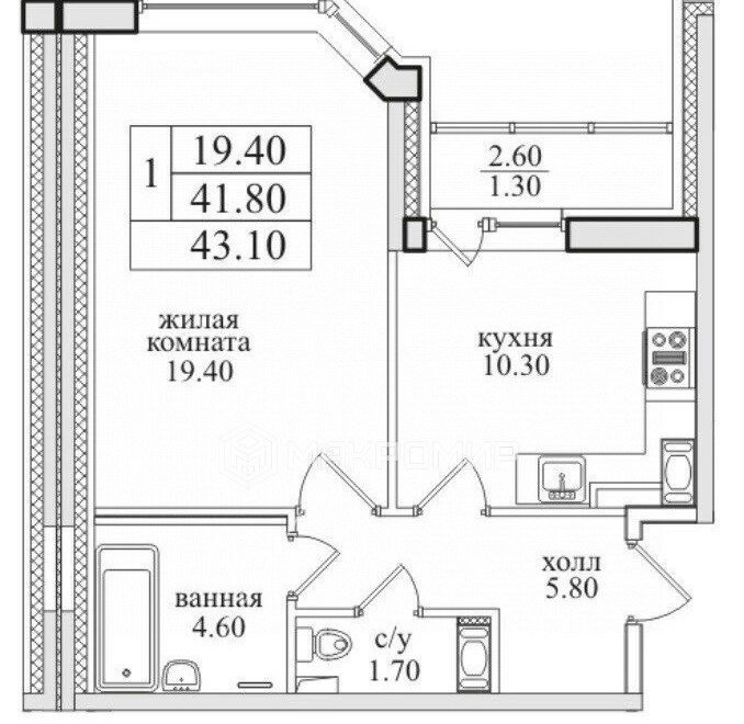 -Общая площадь - 42 м2 (без учёта лоджии). Комната - 20 м2, кухня - 10 м2 соответственно.