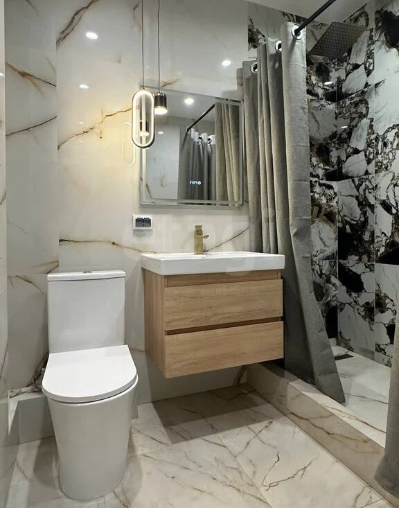 Современный санузел, просторный и светлый , светлые стены добавляют пространство. Раковина тумба, отвечает за комфорт и удобство, зеркало с подсветкой за интресный дизайн, стиральная машинка.