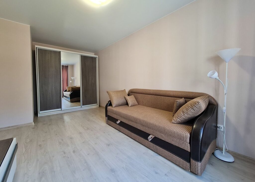 Квартира в отличном состоянии, чистая и аккуратная, укомплектована всей необходимой мебелью и бытовой техникой. В качестве спального места используется раскладывающийся диван. Удобная для жизни планировка - в квартире просторная кухня, светлая комната, совмещенный санузел, вместительная прихожая и балкон с панорамным остеклением. Из окон квартиры открывается приятный вид во двор.